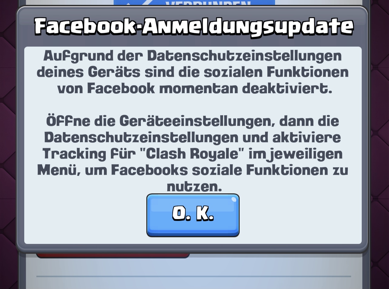 Hey seid dem Update kann ich mich mit Facebook nicht mehr verbinden. Ordnungsdienst sind angeschaltet. Ich hatte dann die verbinden in Facebook (Apps und Websites) mit clash Royale getrennt diese bekomme ich auch nicht mehr auf aktiv. Eventuell kann mir einer weiter helfen ich habe ein iOS Handy