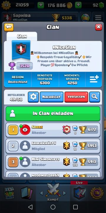 Du könntest gut zu uns passen, wir haben seit heute einen Platz frei - CW Teilnahme ist bei uns Pflicht, Spenden auch - und es klappt auch tadellos đsind schon seit Wochen bei jedem CW auf Platz 1... und unmittelbar vor der legendĂ€ren Liga.
