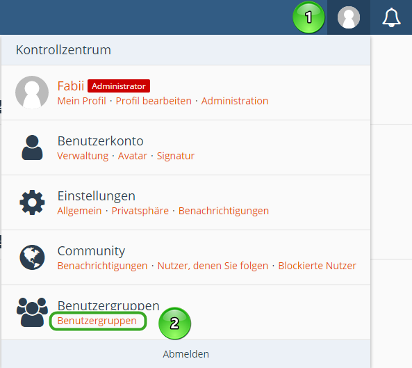 - Klicke auf deinen Avatar oben rechts, und dann auf Benutzergruppen.
