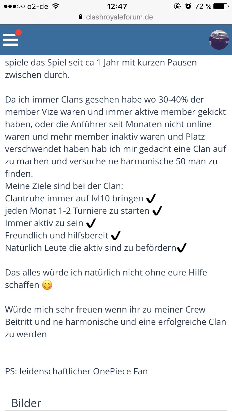 wie die Überschrift schon vermuten lässt bin ich auf der Suche nach einem aktiven, aber eben auch ü18 Clan. Bei den den letzten 3 Clantruhen war ich immer 3stellig bei den Kronen und unter den Top 3. Das bei der letzten Runde Stufe 10 nicht erreicht wurde, hat mich nun zu der Überlegung gebracht, mir eine neue Heimat zu suchen. Ich helfe gern und unterstütze einen Clan so gut ich kann. Aber wenn Andere das ausnutzen sehe ich das nicht lange ein. Ü18 Clan auch deswegen, um Ausreden vermeiden zu können wie: "Ich darf unter der Woche nicht ans Tablet, Hausaufgaben usw." Das mag ja alles stimmen, bringt mich in dem Moment aber auch nicht weiter.