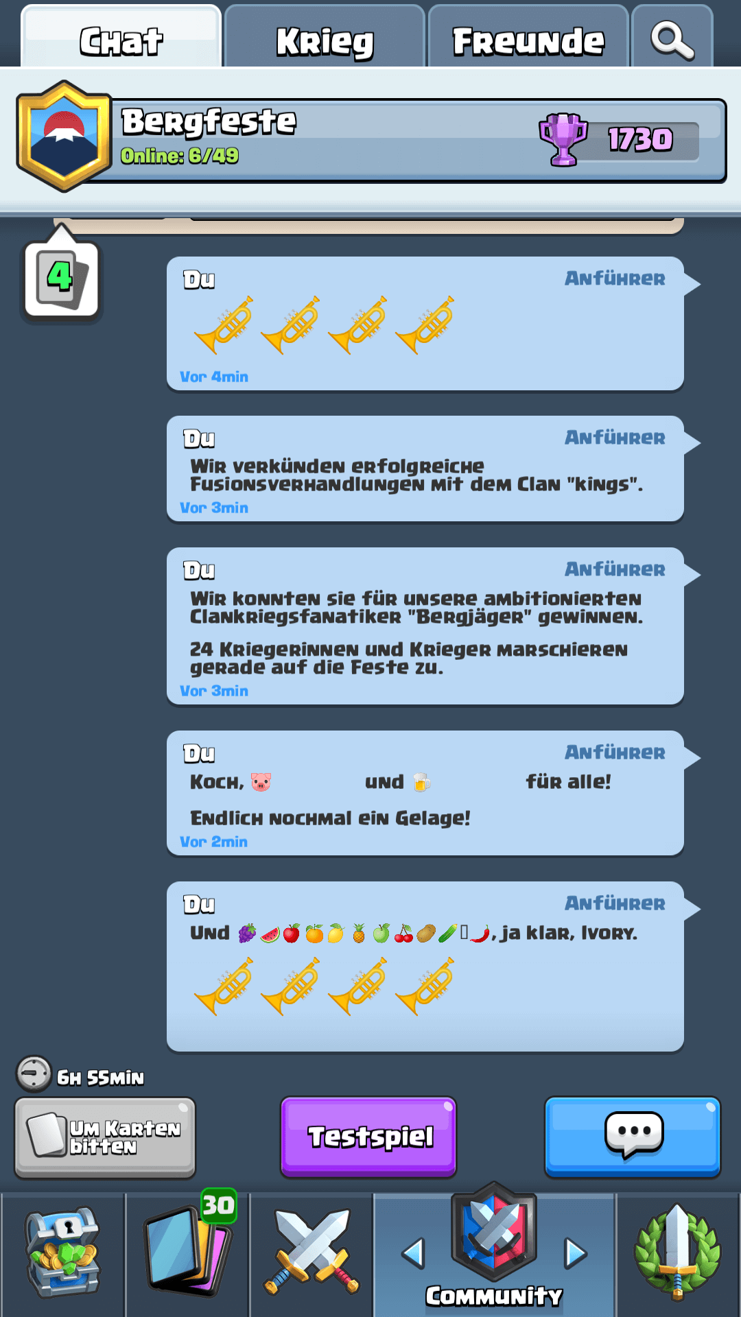 Wir haben uns in die Silber 2 Liga der Clankriege hochgekämpft und stehen aktuell mit 901 Trophäen und ner Goldtruhe (aus Silber 1) ganz gut da ( sollte alles glatt laufen knacken wir heut abend noch die 1000 Trophäengrenze)