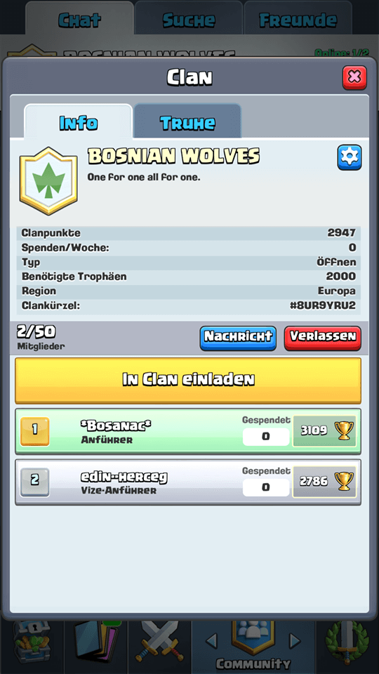 wir (25 und 27) suchen einen aktiven Clan, dem wir uns anschließen können. Als wir anfingen haben wir uns einen verlassenen Clan gesucht um uns wenigstens gegenseitig spenden zu können. Nun wurde der Clan von 3.Klässlern übernommen, die den Chat vollspammen und für die Clantruhen kämpfen wir alleine (immerhin Stufe 5). Das alles nervt ein wenig. Sucht noch wer 2 aktive Spieler? Wir haben 2000 und 19000 Trophäen. Freuen uns auf Angebote!