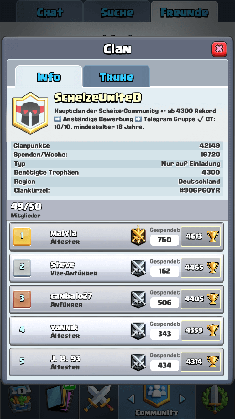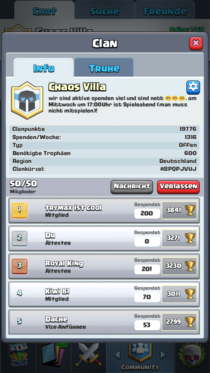 Hallo an alle, bin aktiver Spieler bei aktuell 4600 Rekord. Suche einen guten Clan der Potenzial bietet im Austausch und eine aktive Community dahinter steht um persönlich sich weiterhin stetig zu verbessern und natürlich auch anderen evtl etwas weiter zu bringen. Bin aktiver Spieler daher sollten Kronen/Spenden selbstverständlich sein. Die bewegen sich konstant bei ca 50/1000.