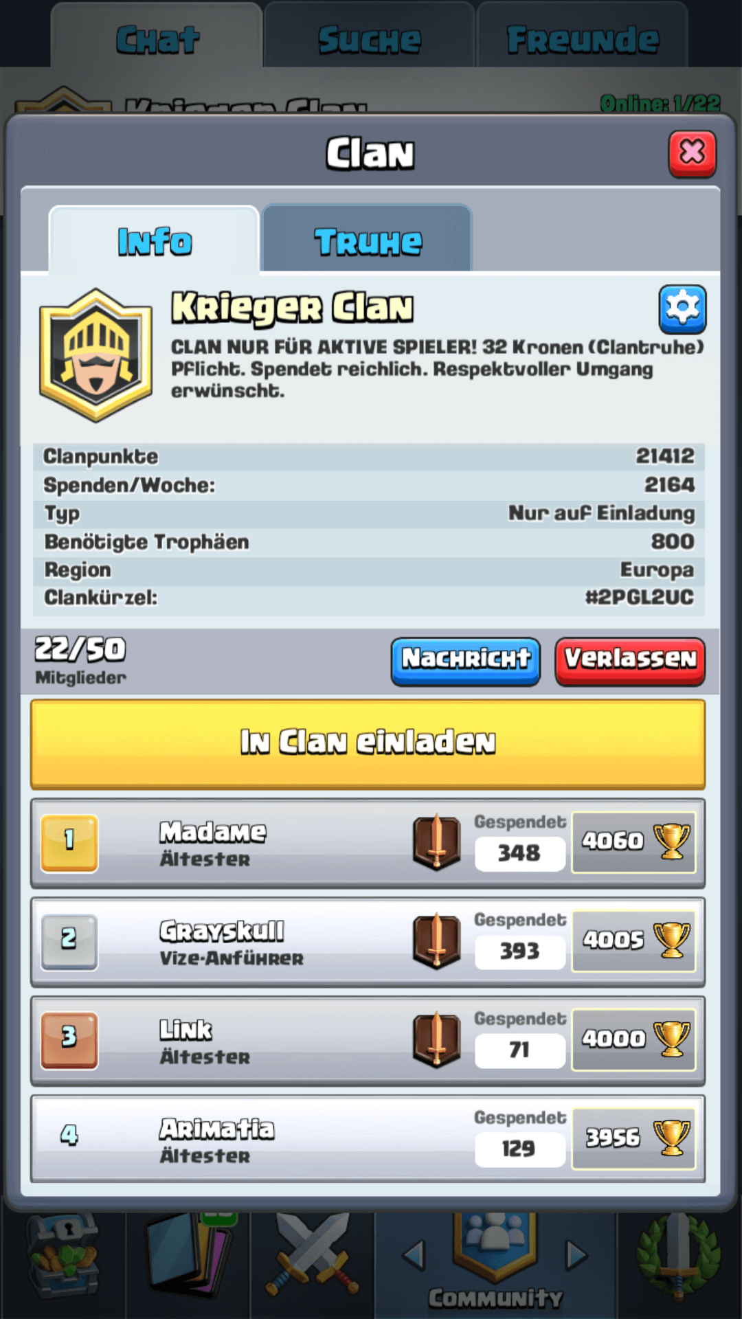 du kannst auch zu uns wenn du willst. Truhe immer 10/10, Pflicht 10 Kronen, Abmeldung natürlich möglich, einige ü30 im Clan.#QPRRG99G LG