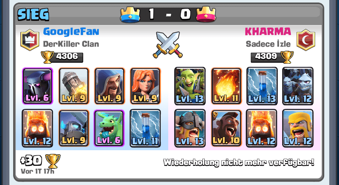 #27 Ich hab hier mal einen Screenshot von meinem letzten Arenakampf angehängt. Dieser blöde Gegner hatte recht viele meiner Hasskarten, vor allem den dummen Feuerball, und alles auf ziemlich hohem Level. ABER: Welch ein Wunder ich habe trotzdem gewonnen... Das zeigt doch, dass man mit etwas Glück, Übung und Auge für Schwächen des Gegners auch gegen so einen gewinnen kann. Daher verstehe ich nicht warum sich alle so über das Matchmaking aufregen... Alles ist möglich und wenn man mal verliert dann ist es doch kein Weltuntergang.