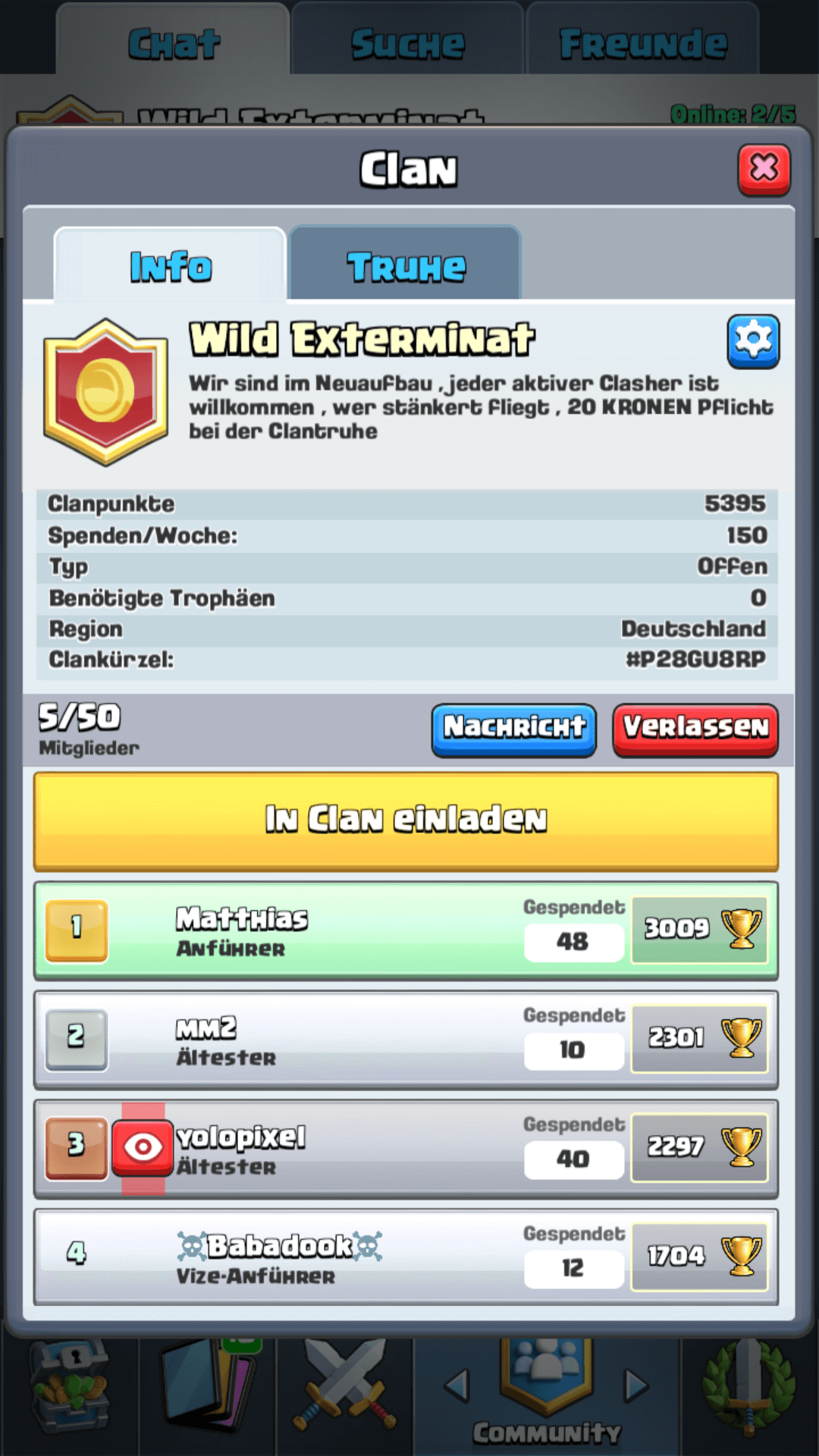 was ich fragen will bzw such oder gern machen wurd wär ein clan der sehr aktive mitstreiter hatt wo man einbisschen trainieren kann und motivation am ständigen besser werden also ich sag mal ich such die clan mitstreiter die bei jeden clan kireg das maximum geben sprich 70-100 kronen pro truhe xd ja das bin ich und suche einen clan bzw. wenn sich gnug melden würd ich mit eich gern so einen starken clan machen da gerade auch die cw kurz vor der tür stehen