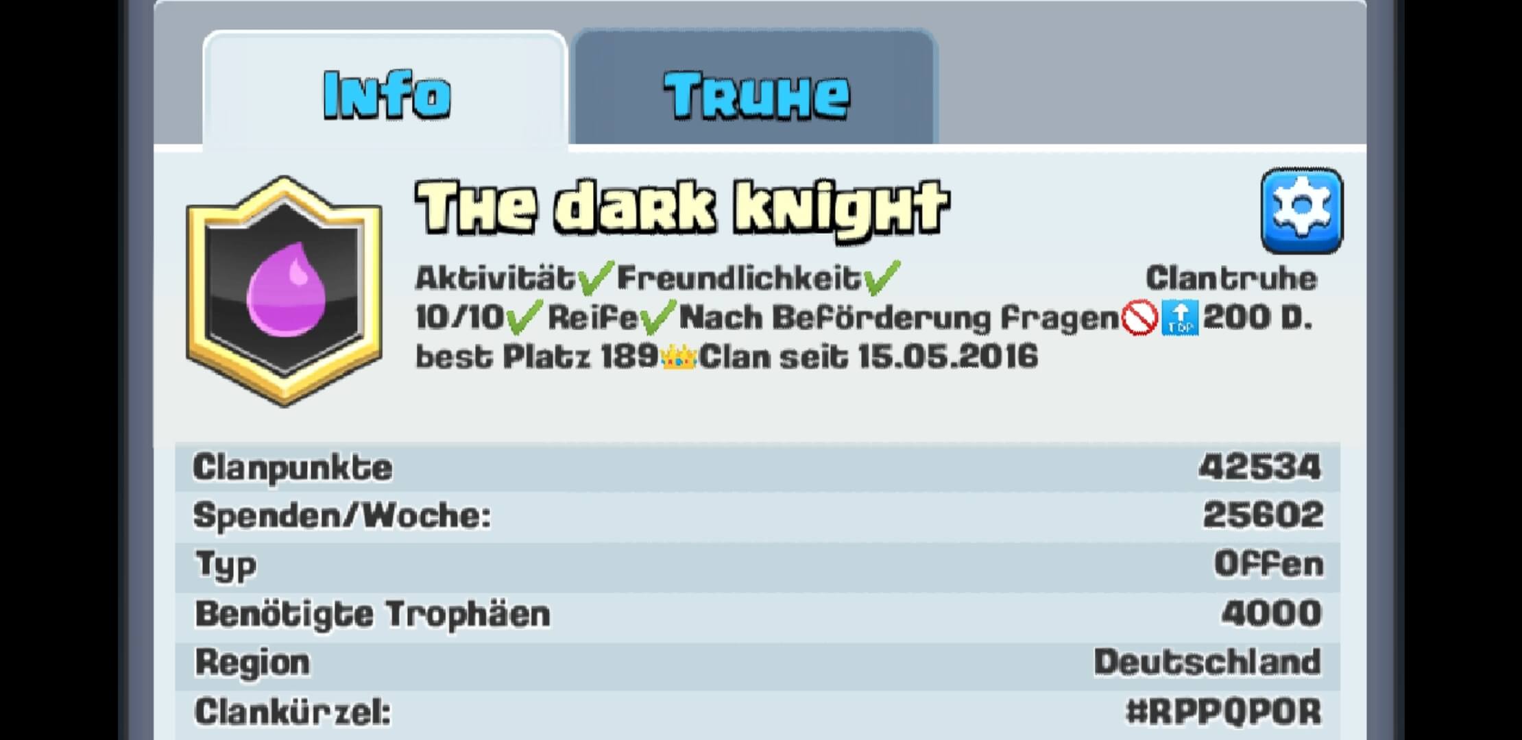 Wir sind ein aktiver Clan mit folgenden Regeln: Von Montag bis Mittwoch 100 Spenden & 30 Kronen bei der Clantruhe (die immer Samstag fertig ist). Vom Alter her ist von vernünftigen Jugendlichen bis Ü40 alles vertreten. Wer sich nicht benehmen kann, bleibt bei uns nicht lange. Für weitere Infos ist hier unsere Clanvorstellung !unschlagbar!, unser Name ist Programm