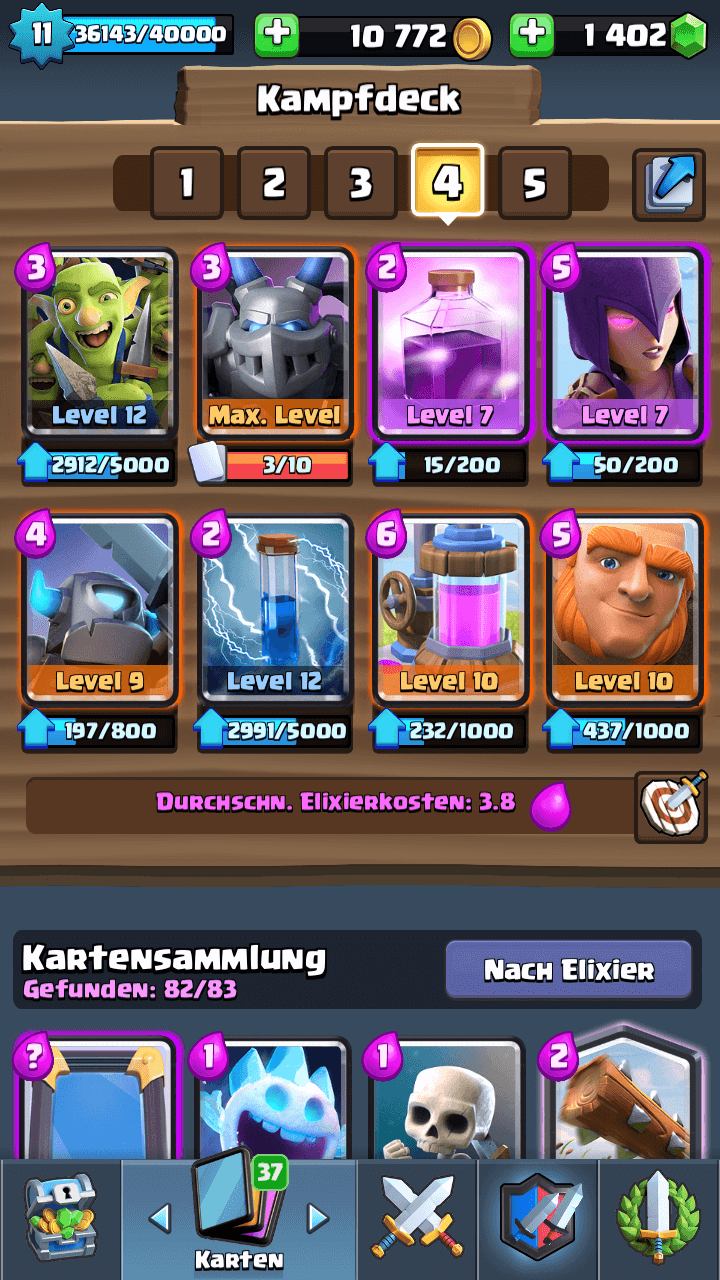 Das Deck ist nicht schlecht, hast aber im Angriff schwächen. Versuch einmal den Elixiersammler mit der Nachthexe zu ersetzen. Dein Elixierdurchschnitt beträgt dann: 3.5