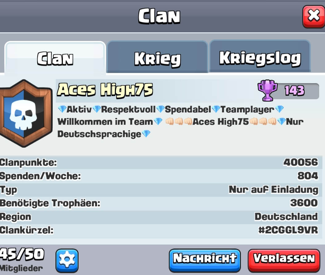 Meine Freundin und ich sind durch mangelnde Aktivität relativ unzufrieden in unserem aktuellen Clan. Wir gurken beide um die 3k trophäen und sind täglich aktiv. Da die Clan Wars nun gekommen sind, suchen wir einen Clan der genauso aktiv ist wie wir und wo auch auf Aktivität geachtet wird.