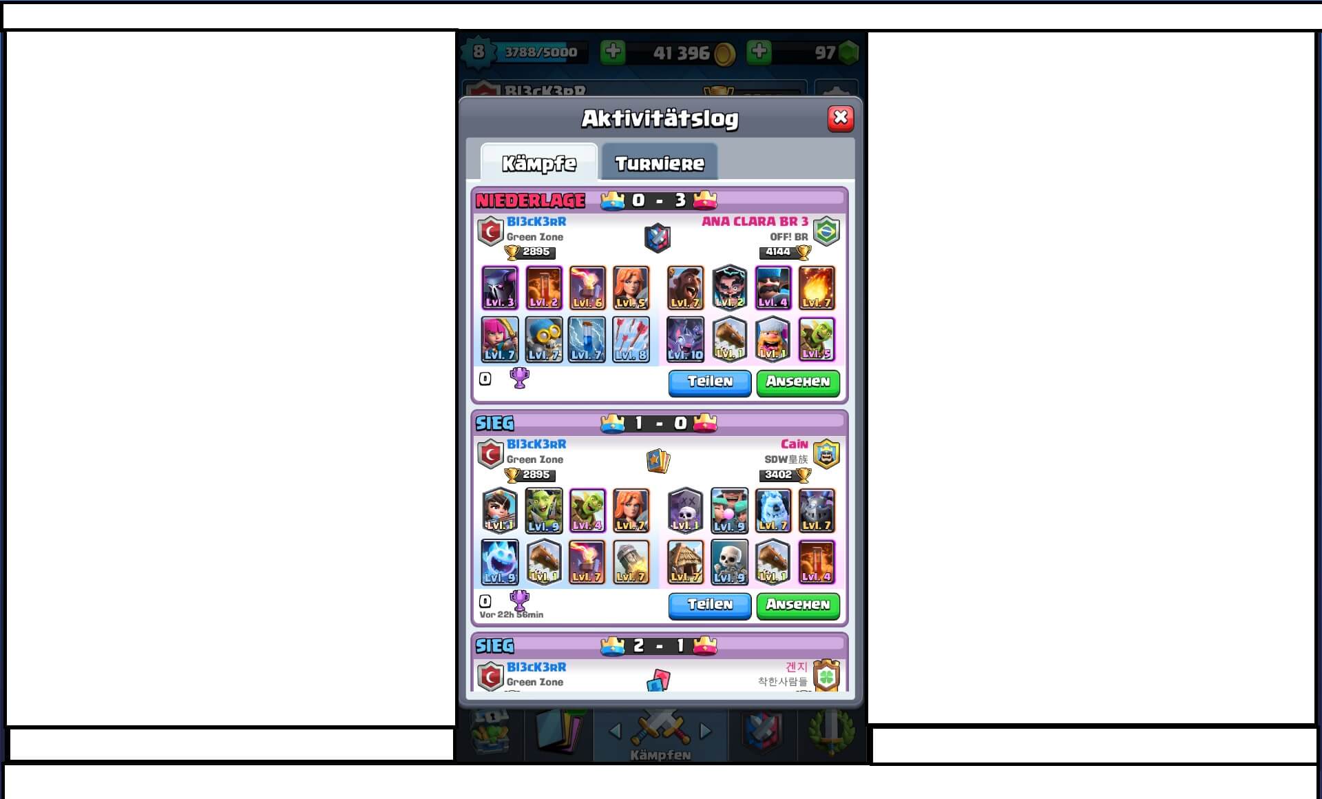 2. Blacker spielt nicht im Zug, sondern zu Hause am Computer, also hier nach allen möglichen Gründen zu suchen, warum Blacker verloren hat, anstatt das offensichtliche zu sehen, dass er schlicht und einfach chancenlos war, das ist meiner Ansicht nach Blödsinn. Hinzukommt ja auch, dass dem Gegner seine Türme höhere Trefferpunkte haben, d. h. der kleine muss mit seinen Low-Level Truppen auch noch mehr Schaden machen um einen Turm zu bekommen.