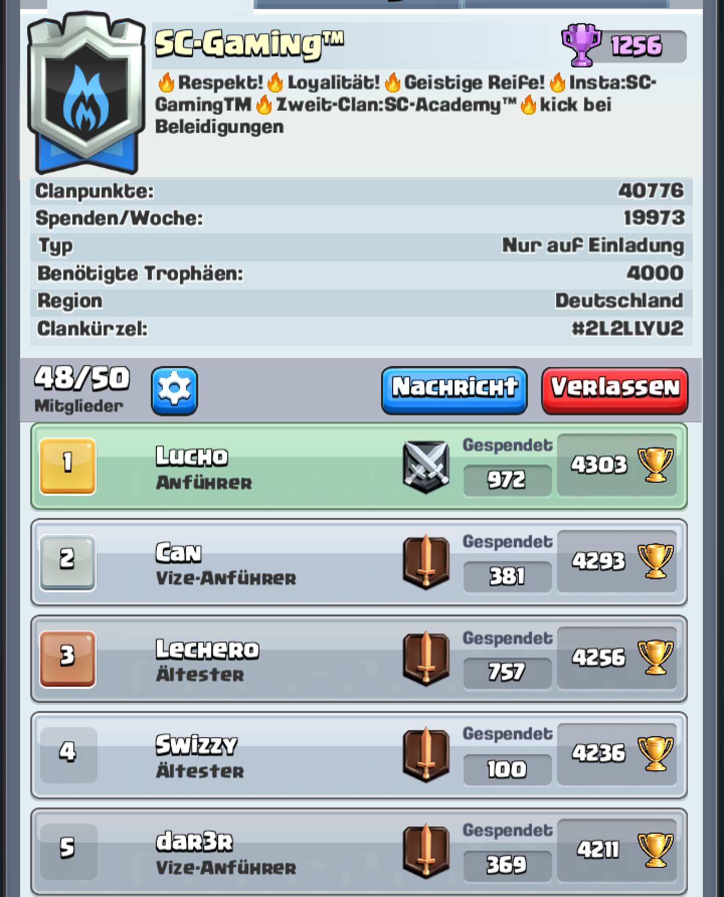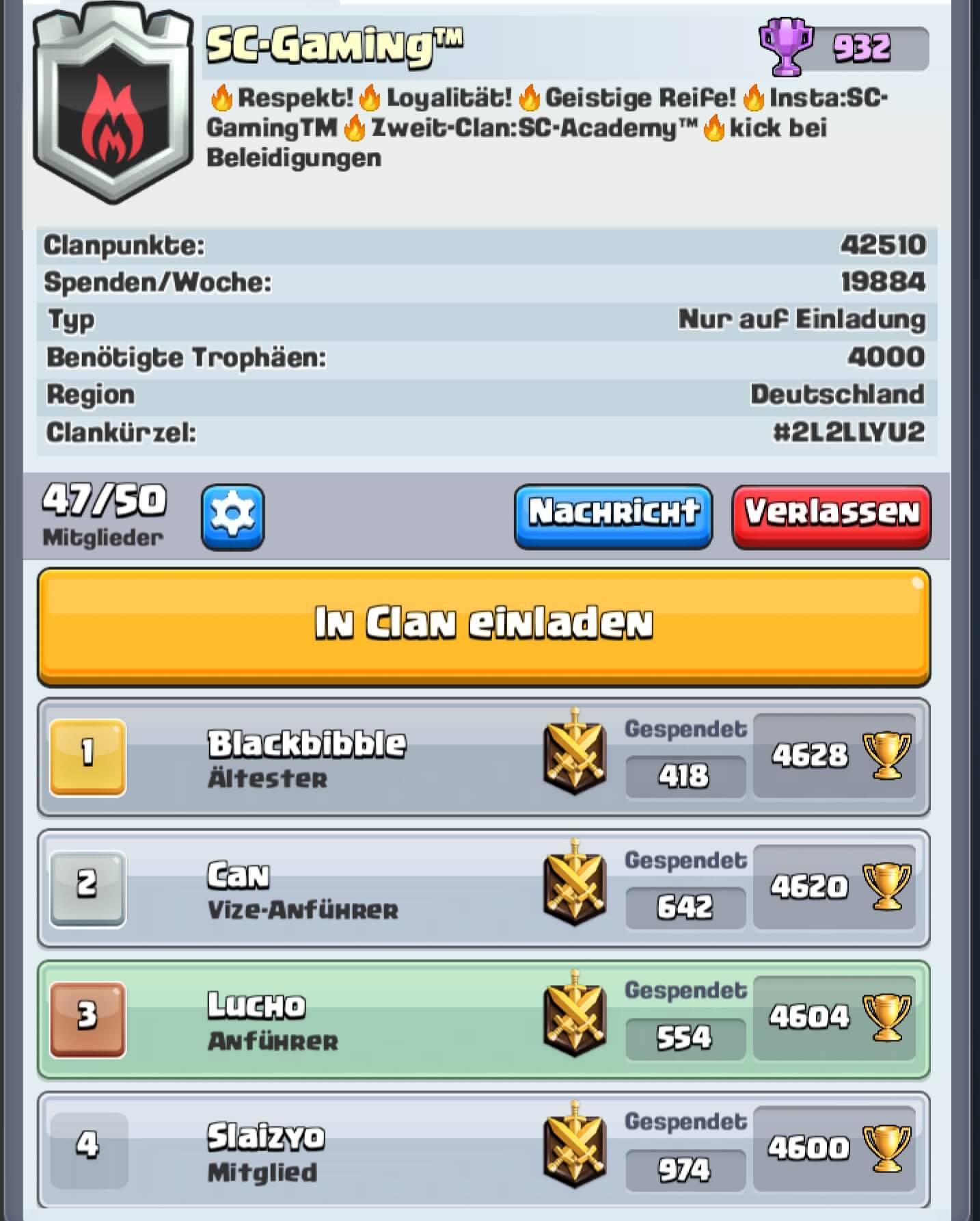 Wir von SC-Gaming™ suchen Spieler ab 4000 Trophäen. Wir wollen es früher oder später in die Top 200 lokal schaffen. Am Ende der Saison liegen wir bei ca. 43000 clanpunkte. Momentan haben wir knapp 40 member mit einem Herausforderer-Abzeichen und unser kurzfristiges ziel ist es 50 davon zu haben. Clantruhe ist meist Samstags voll gewesen... daran sieht man wie aktiv wir sind. es sind immer welche online. wir helfen uns gegenseitig um uns zu verbessern. Wir pushen uns gegenseitig um immer höher zu kommen und erreichen neue Rekorde. Wir sind grösstenteils zwischen 20 und 40 Jahren und somit versteht mm sich im Clan sehr gut. Die jüngeren Member machen einen reifen Eindruck.