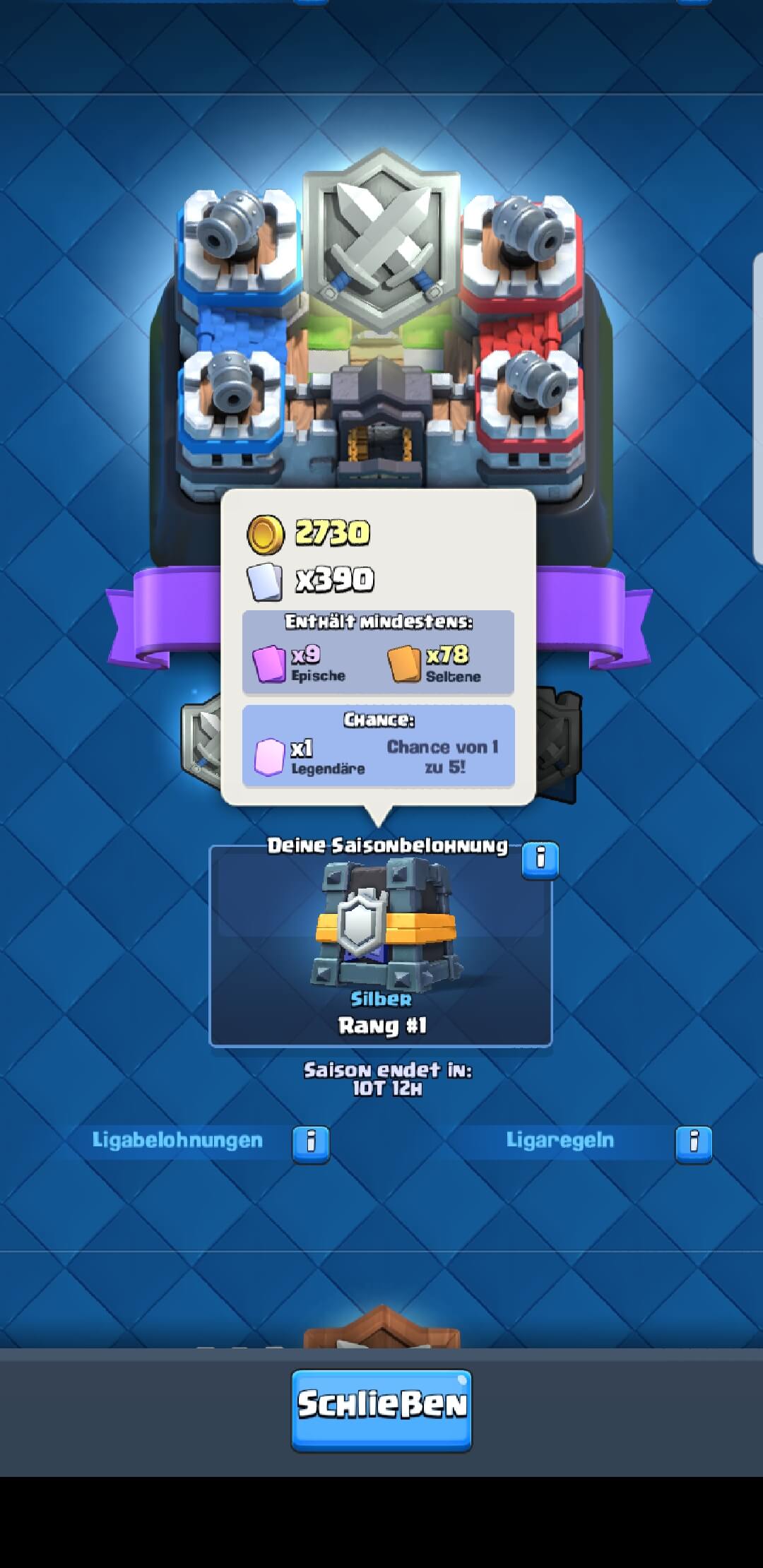 #12 Legis Chance 1 zu 5 ist doch mal nicht schlecht, da kann man dann auch zwei Wochen drauf warten finde ich. Und Gold gibt's ja auch für die Sammel- und Kriegskämpfe - in Silber 750 alle zwei Tage, macht man alle Kriege mit sind das nochmal 5250, also zusammen fast 8000, das ist doch besser als zwei 10er Clantruhe.