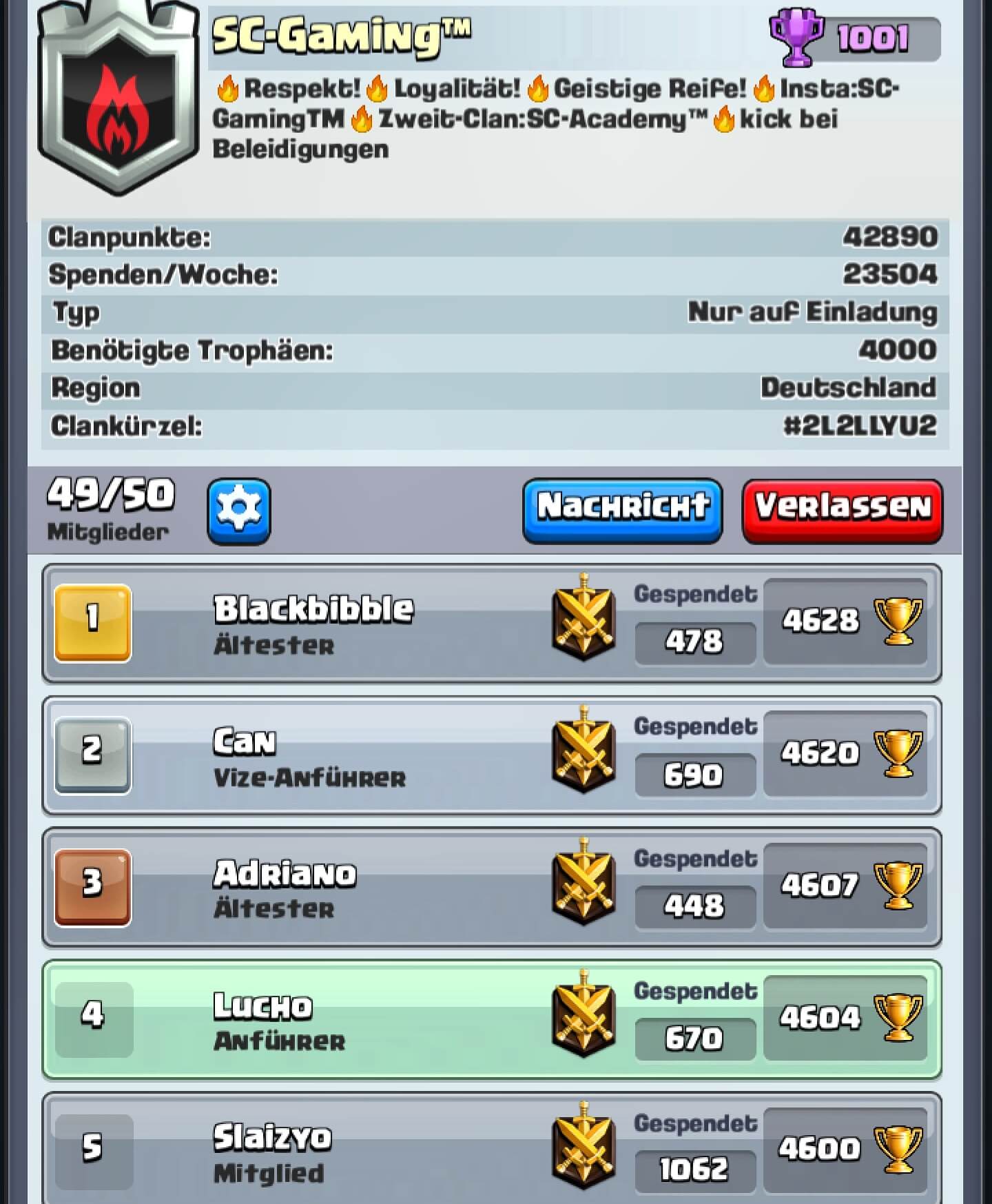 Für Leute unter 4000 Trophäen haben wir den zweit Clan SC-Academy. Dort können die Leute sich verbessern und ab 4k im den ersten Clan aufsteigen sofern Platz ist. Wir sind in beiden Clans viele die privat befreundet sind oder einfach lange zusammen clashen.
