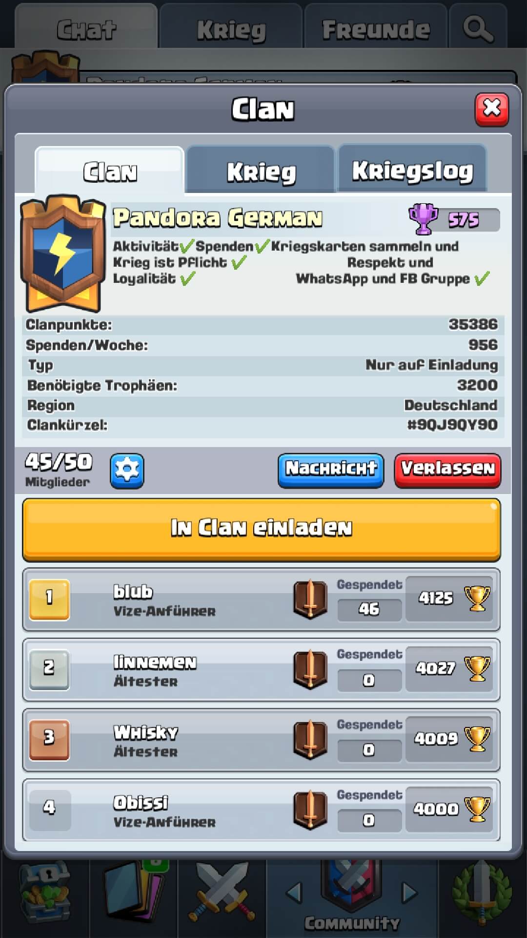 Ich suche einen Clan mit netten, aktiven und vor allem GUTEN Spielern, die nicht nur wegen ihren kartenleveln bei 4000+ sind. Dementsprechend auch die clanpokale (1000+) ist erwĂŒnscht. Bin zwar momentan in einem solchen Clan, aber das Miteinander fehlt etwas. Deshalb suche ich einen Clan der eben auch diesen Kritikpunkt erfĂŒllt đ”