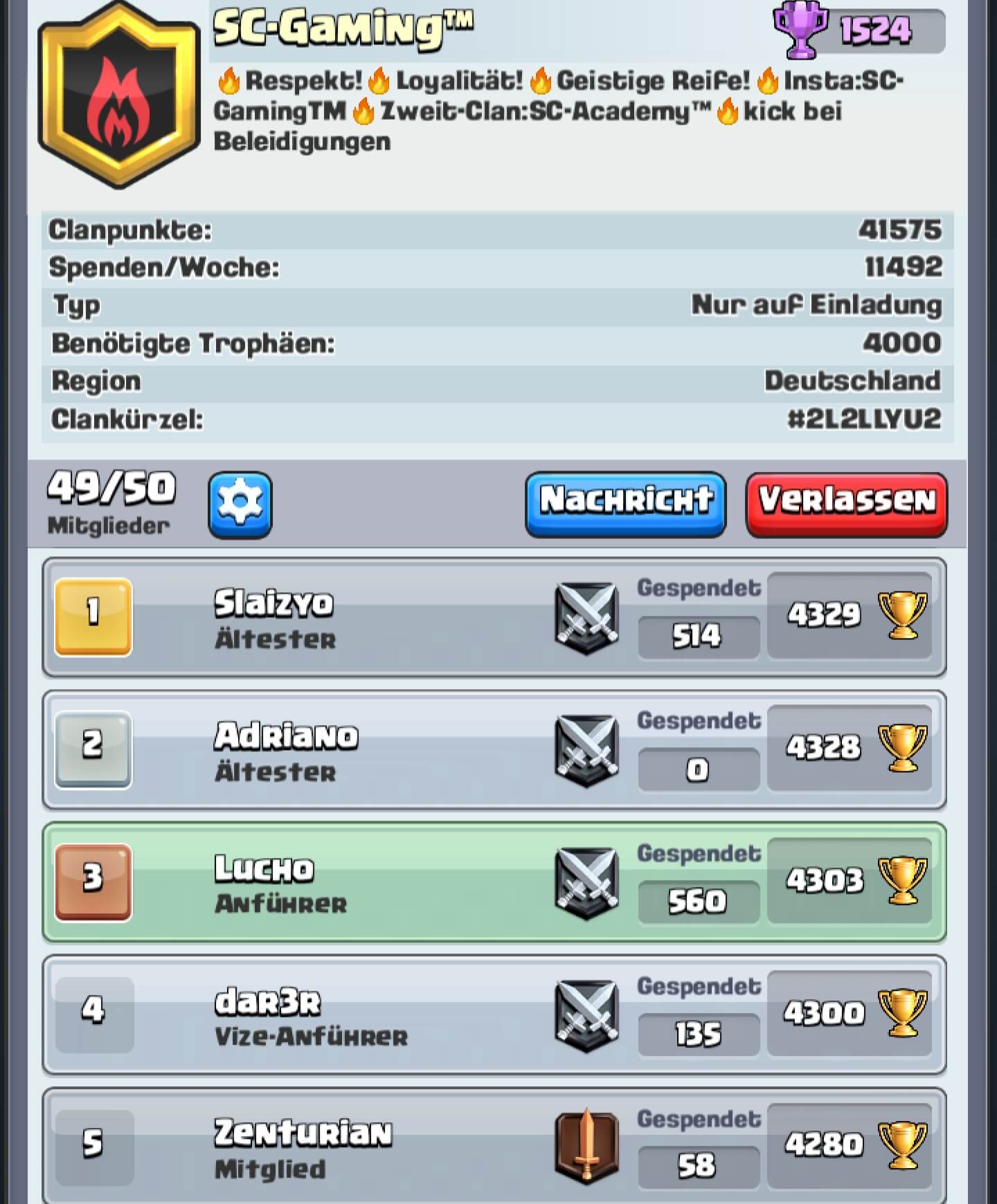 ich/(wir) bin auf der Suche nach einer neuen Herausforderung um mich weiter zu verbessern da ich momentan so ein wenig auf der stelle trete. Da ich die 40 schon länger gepackt habe suche ich einen Clan der im Schnitt mein alter entspricht. Bin seid ca. 1,5 Jahre aktiv im Spiel und Spenden freundlich.... Mein Kürzel #2LVUQL88J. Hätte eventuell noch zwei Freunde mit 4,3K und 3,6 K die ggf. nachrücken würden wenn Platz wäre. Sollten sich meine Vorstellungen mit euren Vorstellungen decken würde ich mich über eine Nachricht freuen. Wünsche alle weiterhin viel Spaß und Erfolg mit Clash Royale