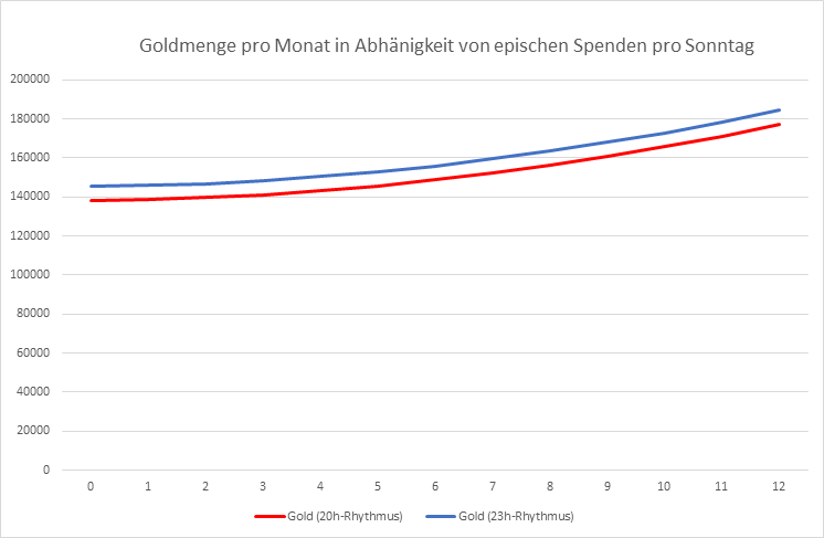 Da die Goldmenge pro Monat, welche man durch die epischen Spenden am Sonntag erhält, sehr stark von der Anzahl der Spenden abhängt, habe ich diese Einnahmequelle vorerst nicht berücksichtigt. Dennoch möchte ich diese Größe in die Berechnung einbauen und habe nun die Gesamtgoldmenge pro Monat in einem Diagramm dargestellt: