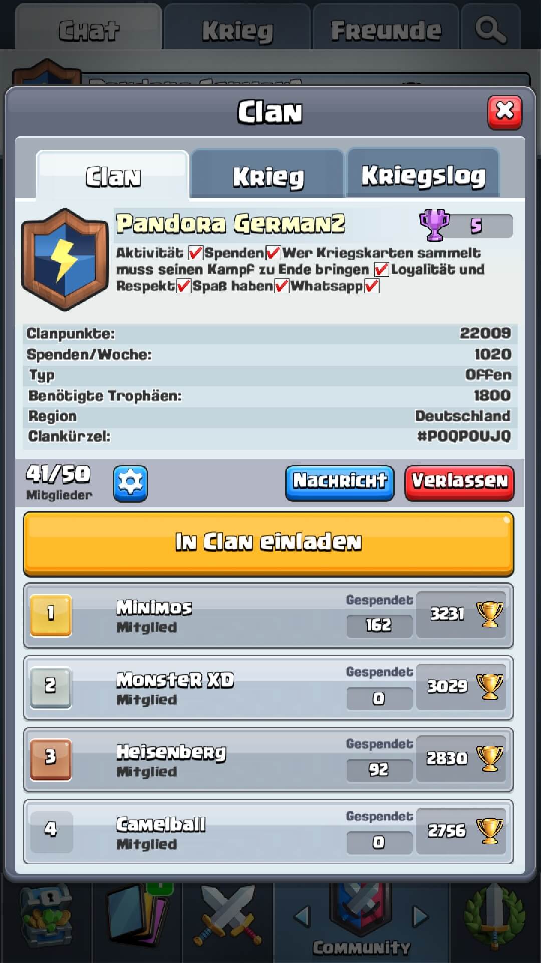 Ich suche einen netten Clan, der auch spendefreundlich ist. Ich persönliche Spende sehr gerne, finde es aber schade wenn es nur 1-2 spendefreudige im Clan gibt, ich bin schon von unzähligen Clans hin und her Gewächselt, weil sehr wenig bis garnichts von den Clan Mitgliedern kam. Weshalb ich es nun hier versuche, da es mit einem Clan doch mehr spaß macht. Sobald ich das Level dazu habe würde ich auch an den Clankriegen teilnehmen.