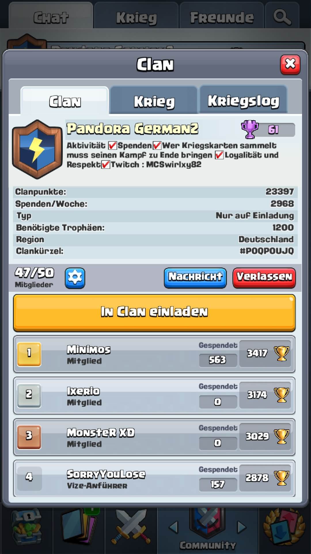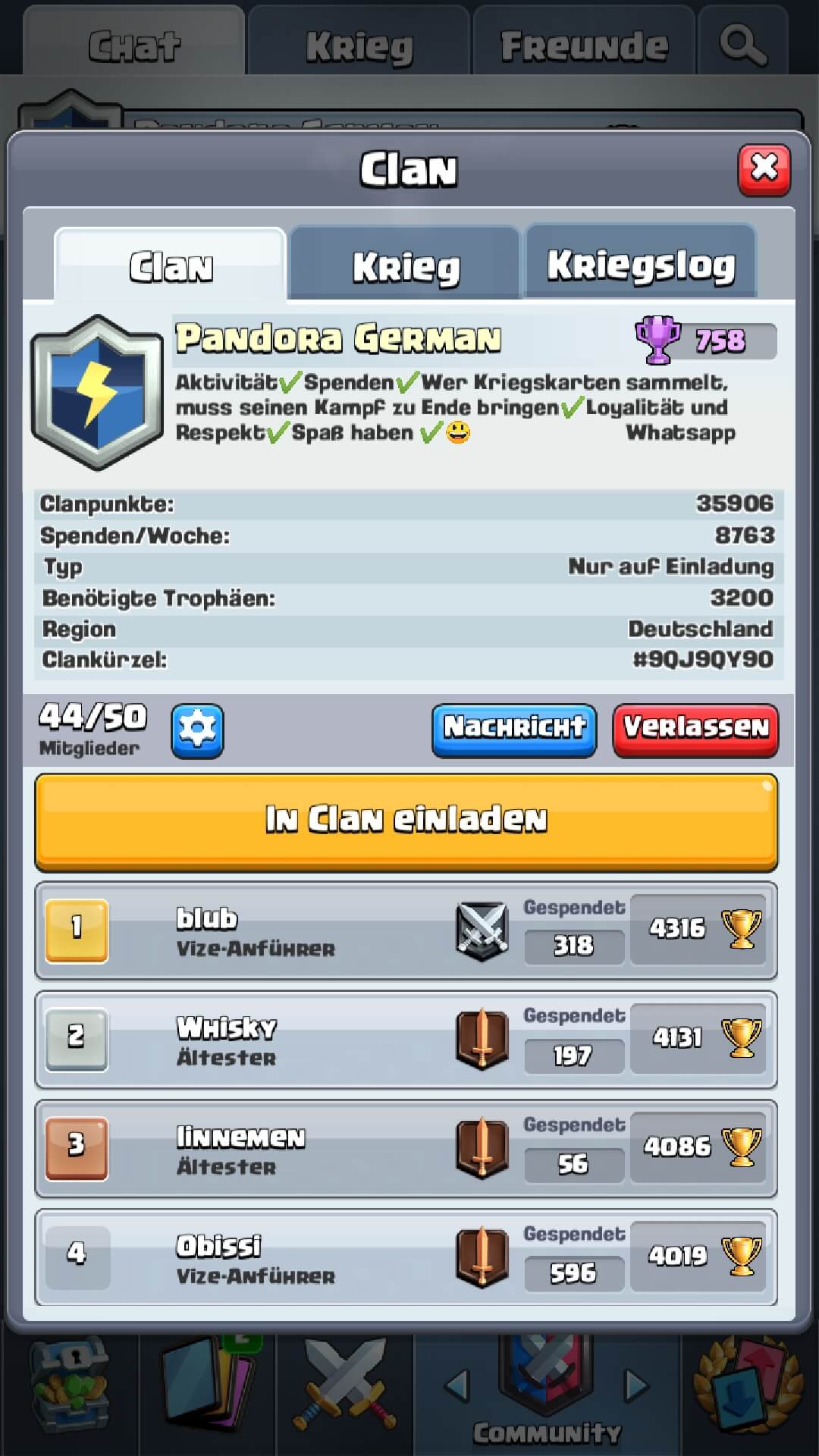 Mein Deck besteht aus Fledermäusen, Königsriese, Musketierin, Walküre, Magier, Banditin, Tunnelgräber, Invernodrache. Bin bis jetzt, sehr gut damit gefahren. Habe momentan 2201 Pokake. Bin Ältester, in meinem Clan. Der Clan ist leider zu klein, bloß 9 Mitglieder. Ich oder besser der Clan kommen nicht weiter. Ich möchte gerne, ihn einen größeren Clan. Mit freundlichen Mitglieder und so wie ich, immer bereit sind, für einander da zu sein. Nach dem Motto einer für alle und alle für einen. Spiele täglich, gebe gerne Karten und bin freundlich im Umgang mit denn Mitspielern. Hätte gerne einen Deutschen Clan, ich selber komme aus Bayern.