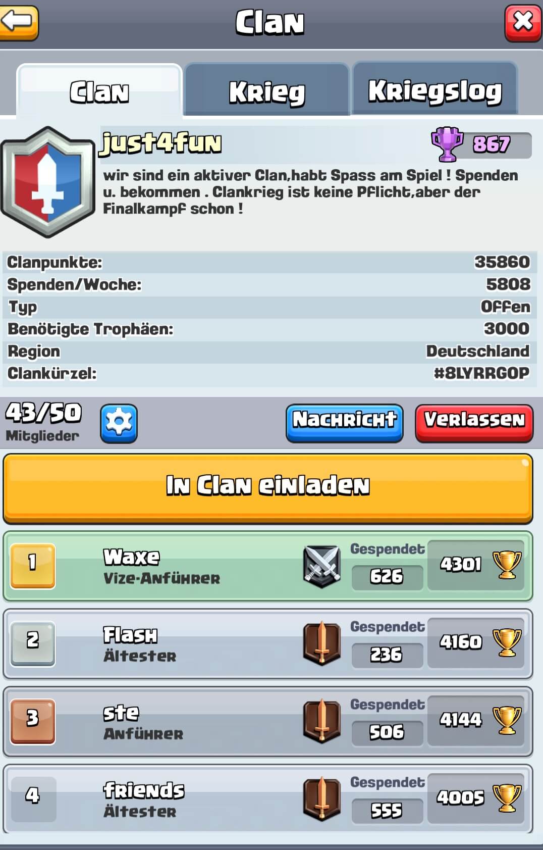 wir suchen auch immer aktive Spieler, nehmen mehr (Dauerkrieg) oder weniger (Teilnehmerzahl zwischen 10 und 15) aktiv an Clankriegen teil und treiben uns in der Mitte der Silberliega rum. Gespendet wird fleißig und man bekommt auch alles, da die aktivsten Spieler ab Arena 12 zuhause sind.
