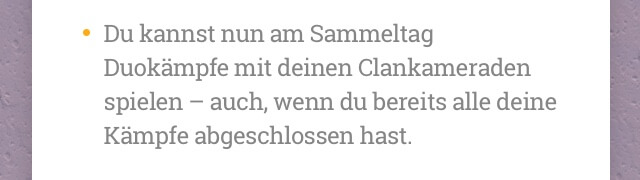 Duokämpfe mit Clankameraden waren doch zuvor auch schon möglich beim Sammeln. Und wo kann man dann weiterspielen Duo‘s trotz beendigung der Sammelkämpfe und zu welchem Nutzen ?