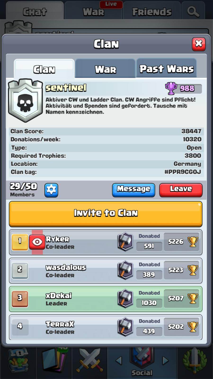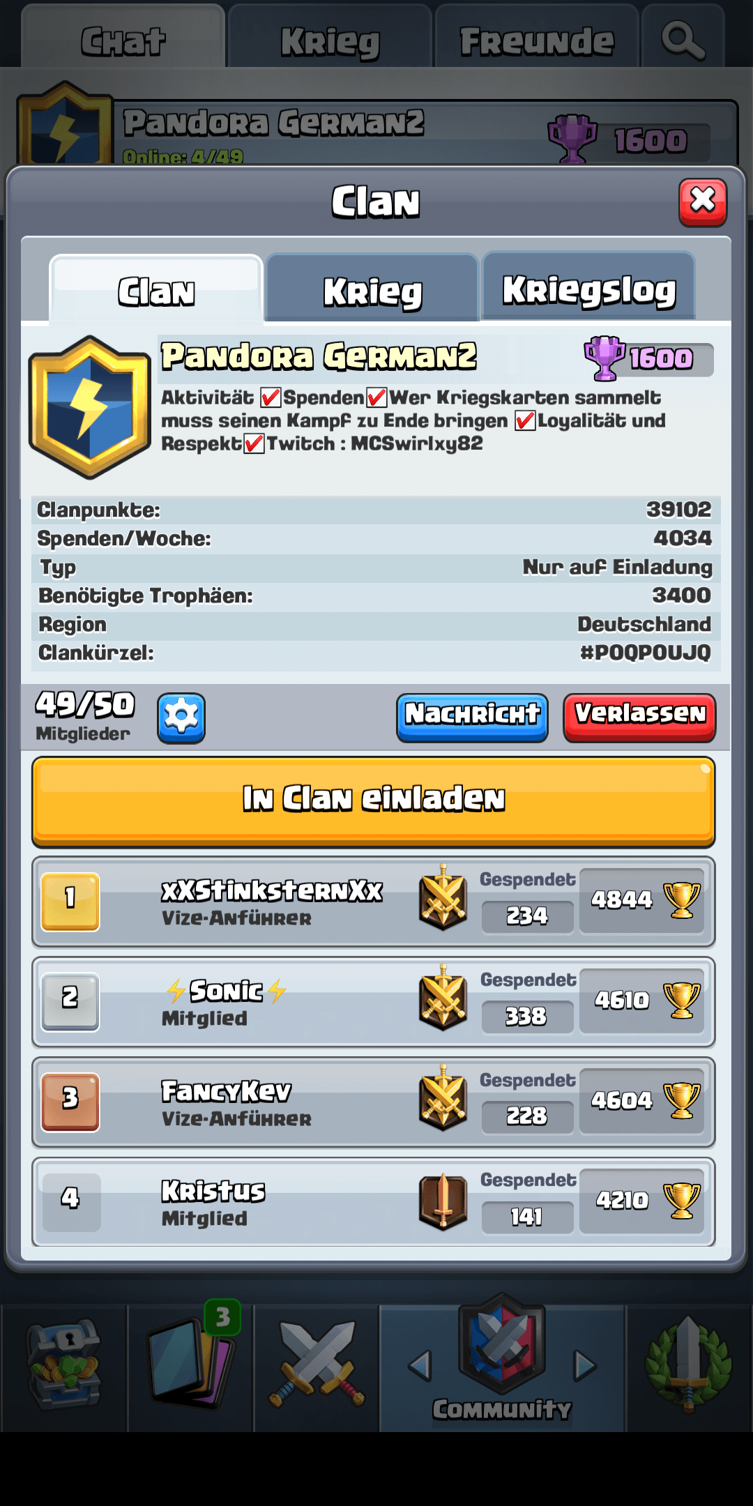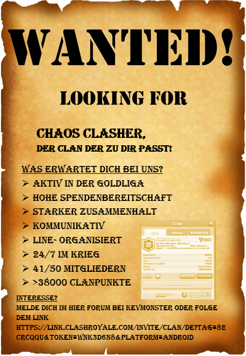 Ich bin auf der Suche nach einem Aktiven Clan. Meine derzeitige Bleibe hat eine CW-Beteiligung von gefühlt 20% und die allgemeine Kommunikation ist nicht vorhanden. Ich bin derzeit irgendwo zwischen 4000-4200 Pokis, arbeite mich aber ständig hoch. Leider erst LvL10 deshalb kann es sein, dass ich beim CW nicht immer so perfekt abschneide, wenn es in die höheren Ränge geht. Ich Spende viel, immer offen für trades und bin alles in allem sehr aktiv im Spiel.