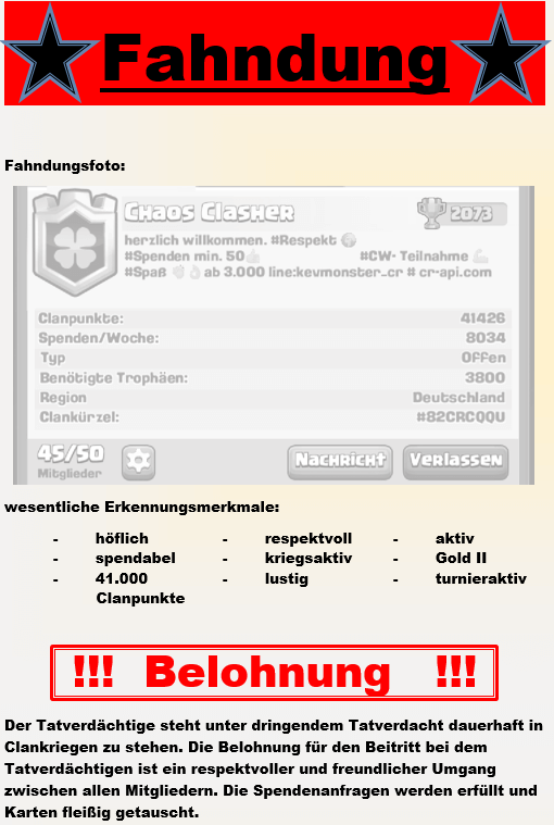 suche einen Clan der eine hohe Aktivität hat, CW Teilnahme sollte eine Selbstverständlichkeit sein. Altersstruktur sollte über 25 Jahre sein, da ich die 30 schon weit überschritten habe.