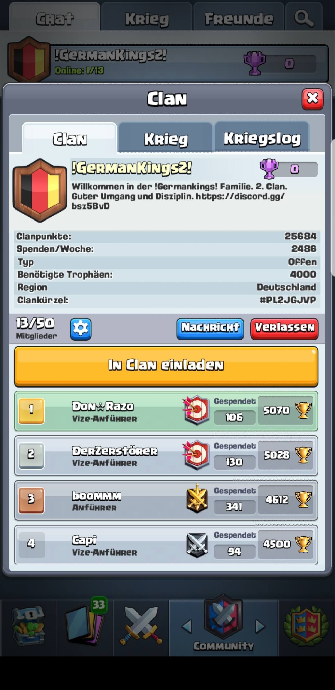 falls es für euch eine Option ist. Wir haben vor einem Monat ebenfalls unseren alten Clan verlassen und gemeinsam einen neuen gegründet. Wir sind momentan auf 1030 Clankriegstrophäen und steuern gerade wegs auf die Goldliga zu, was aufgrund von mangelnder Ernstnahme und schlechtem Clan Management vorher nie gelungen ist - daher auch der Austritt... Wir würden schaffen euch alle 13 unterzukriegen, da ich erst heute ein wenig ausräumen musste und einige unangekündigt und angestupst ihren Finalkampf verpasst haben. :(