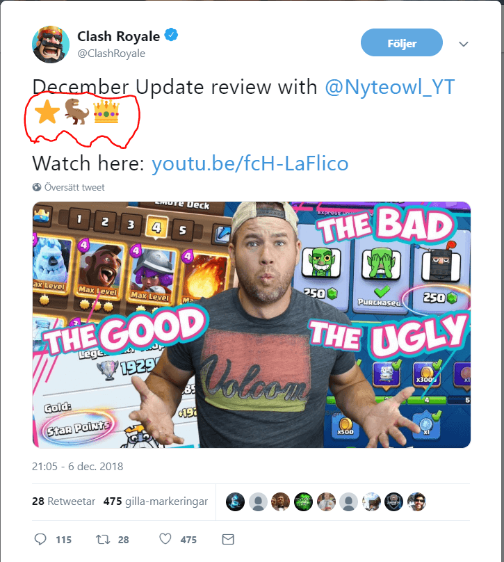 Hier hat man ein Review von irgendeinem Youtuber zum Update verlinkt, das interessante daran sind die Emotes zu dem Text, die ich rot eingekreist haben: Ein Dinosaurier und eine Krone, genau wie im Video.