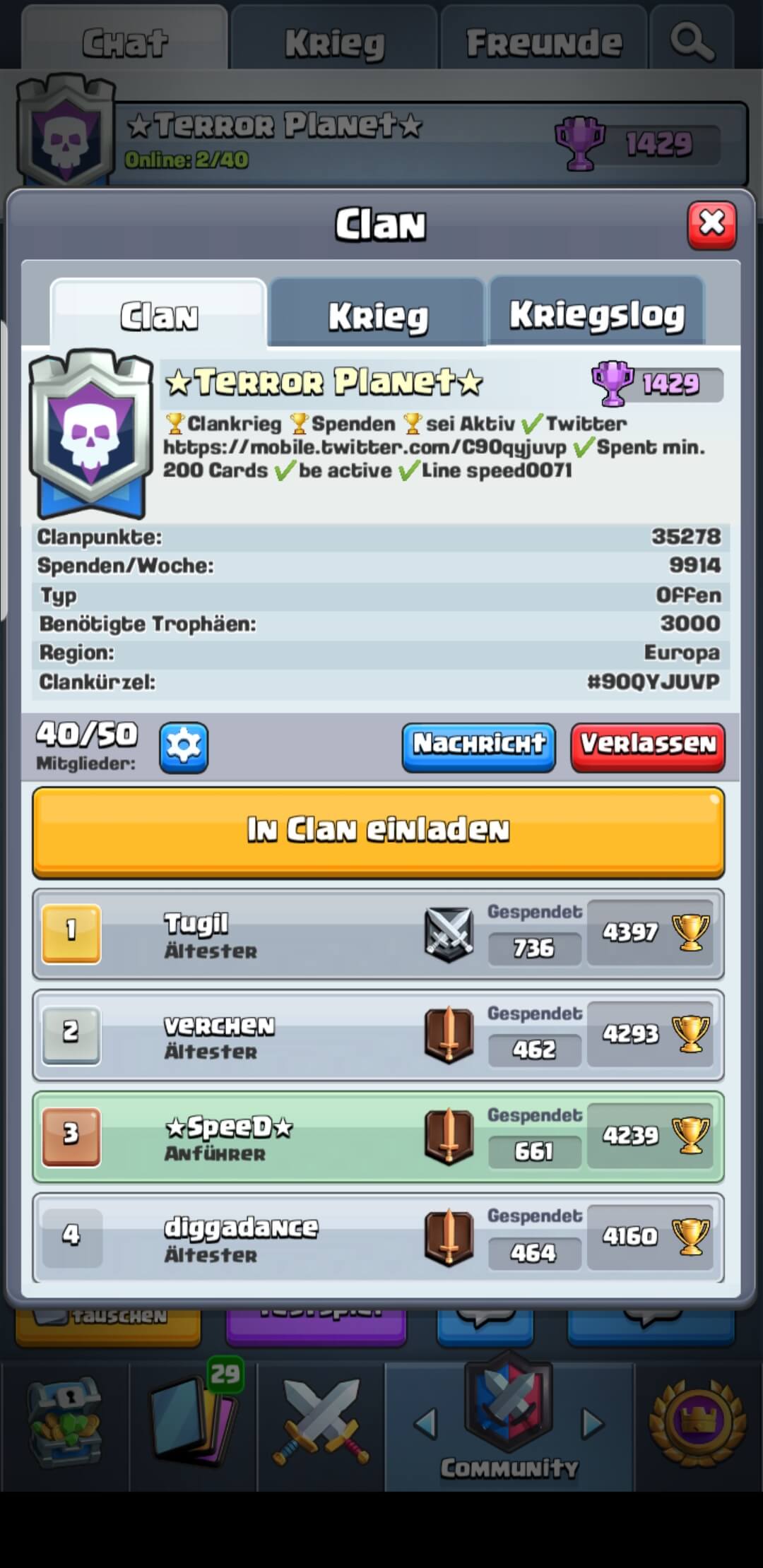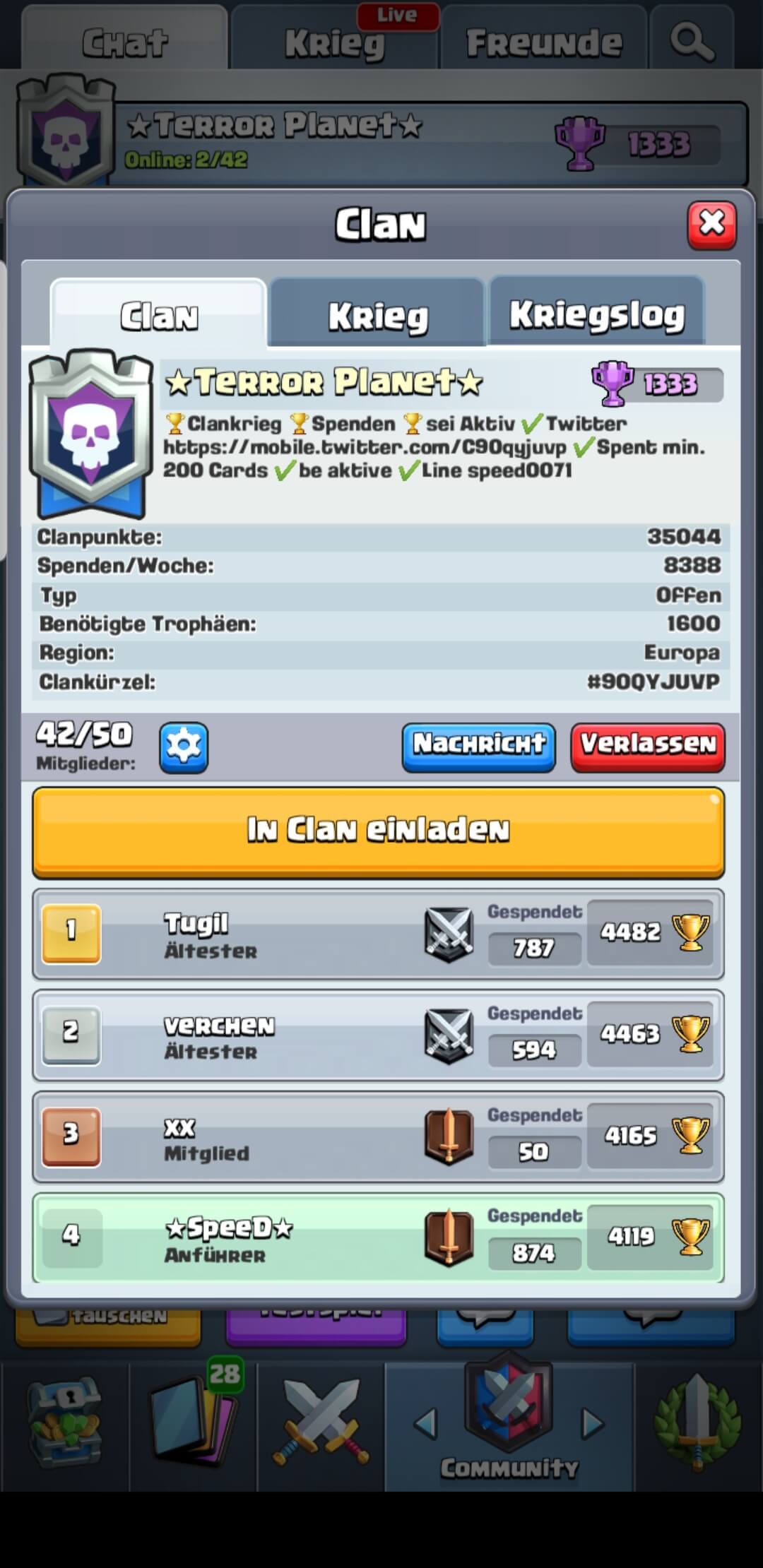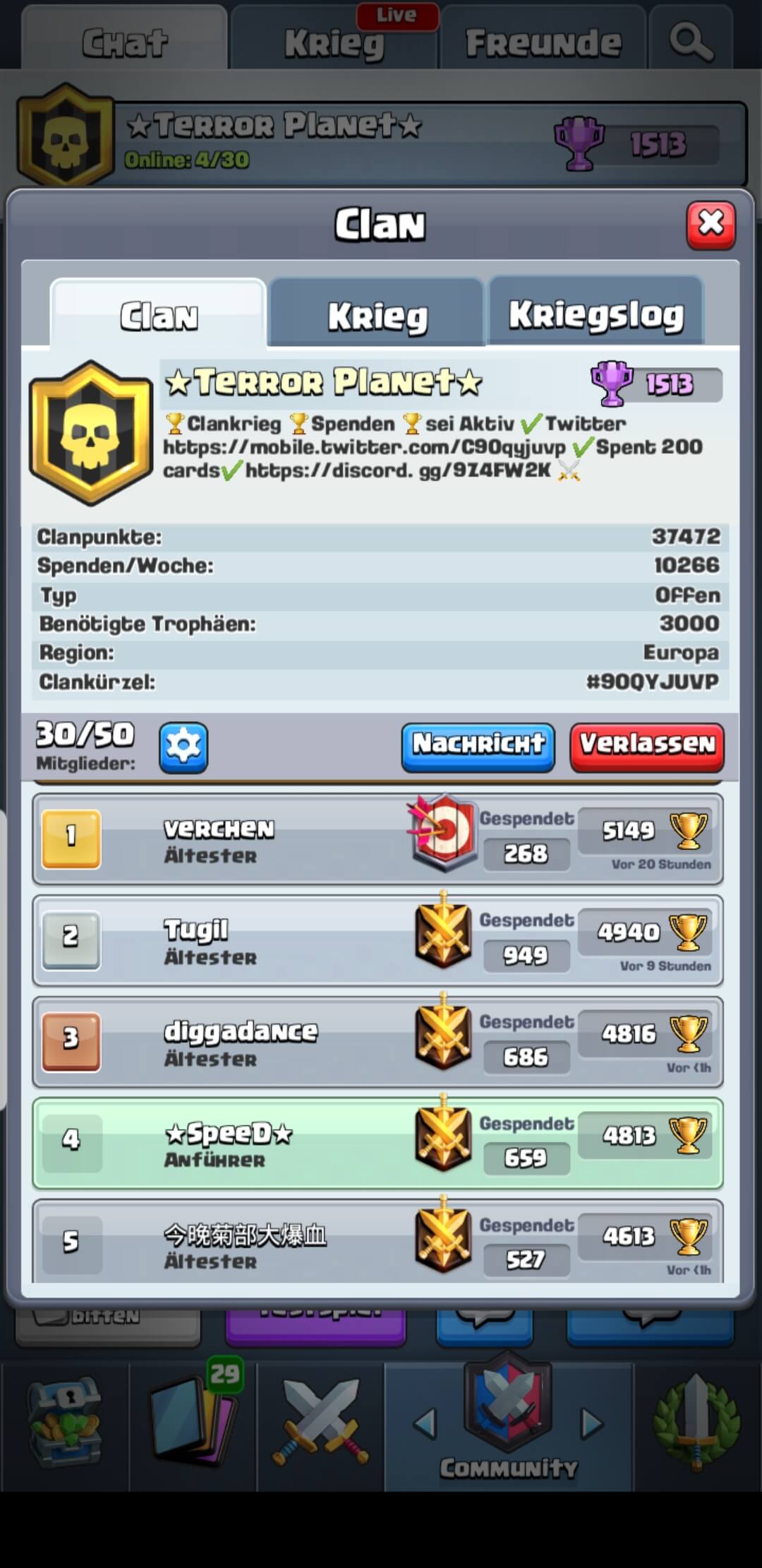 seit Aktiv,spenden min.200 die Woche,spiele Clankrieg wenn du willst,freundlicher Umgang,keine Beleidigung / no Spam !!!