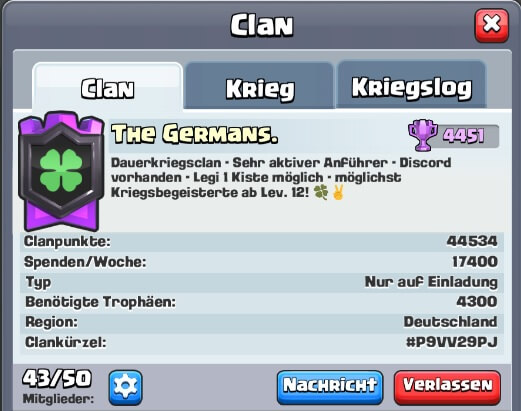wir "The Germans.", suchen aktive und motivierte clanwar-aktive Mitstreiter ab Königslevel 12.