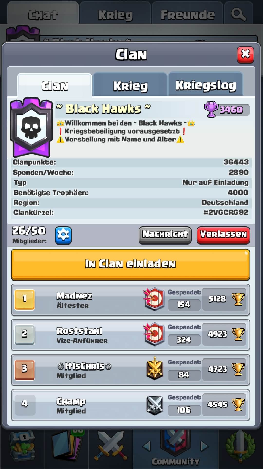 Wir sind 26 aktive Krieger und halten uns konstant in der Legenden Arena bei 3400+ Trophäenund erreichen jede Saison Platz 1.