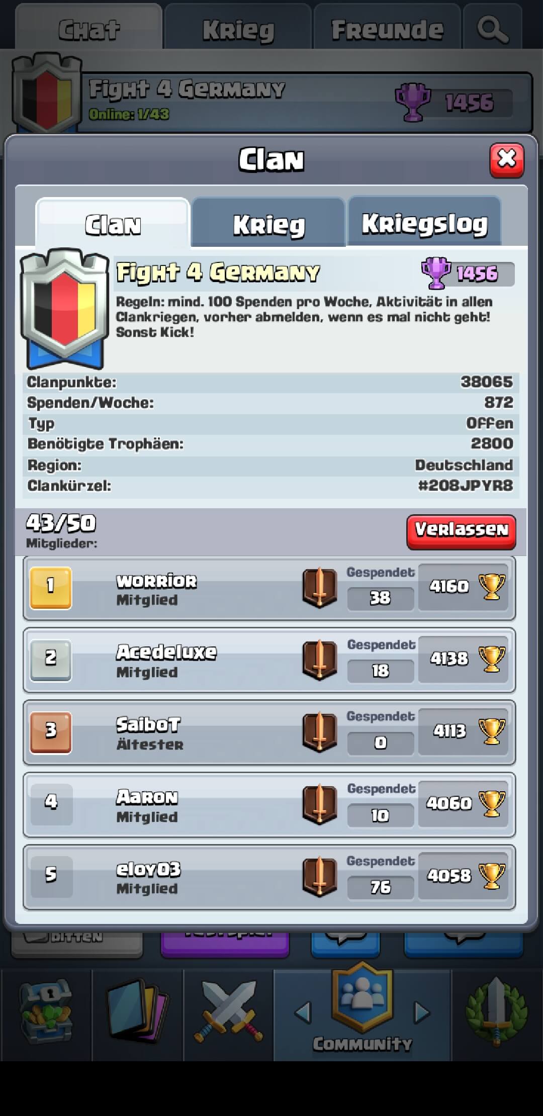 Da sich unsere Mitglieder gegenseitig sehr stark mit Spaß am Spiel pushen, haben wir auch nie ein Problem damit, wenn die Neuen aktuell noch eine niedrigere Trophäenzahl mitbringen. Sie haben sich bei uns bisher immer schnell steigern können. Hierfür haben wir einen guten Austausch im Chat für Decktipps und Test- und Duokämpfe.