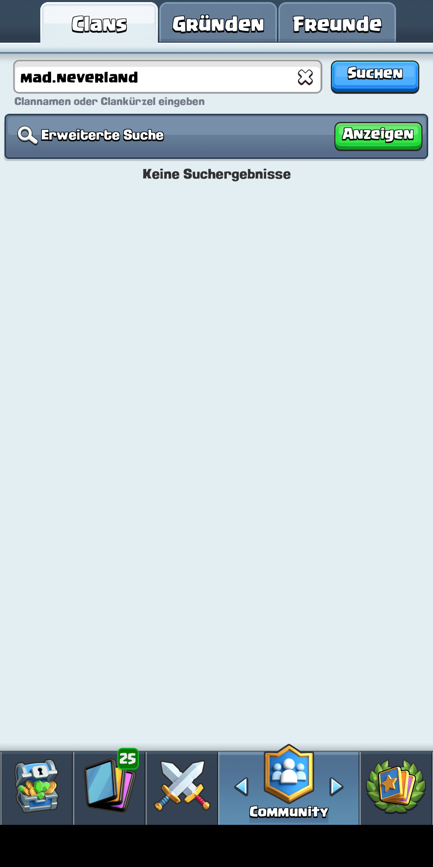 Guten Abend Forum, ich habe schon bemerkt dass die Clansuche Probleme macht und nur sehr langsam funktioniert, aber erst jetzt ist mir aufgefallen dass unser Clan mad.neverland in der Suche überhaupt nicht mehr auffindbar ist. Andere Clans kann ich problemlos finden, nur den hier nicht. Weder über den Namen, noch über #2Q9LUG0P. Wir haben zwar einen aktiven Kern aber mir ist schon vor einiger Zeit aufgefallen dass wir keine Mitglieder mehr bekommen ohne wirklichen Grund. Schlecht sind wir auf jeden Fall nicht, aber ohne Zuwachs kann das nicht lange gutgehen. Sind wir die einzigen mit solchen Problemen?