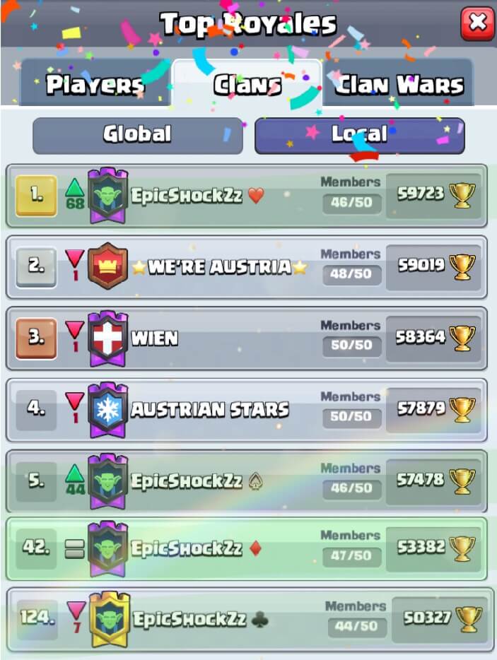 Vielleicht ist jedem Epicshockzz schon bekannt. Epicshockzz â„ïžist Nr.1 in Ăsterreich. Unsere andere 3 Clans ( Epicshockzz â ïžâŠïžâŁïž) sind ebenso alle top 200 Ăsterreich.