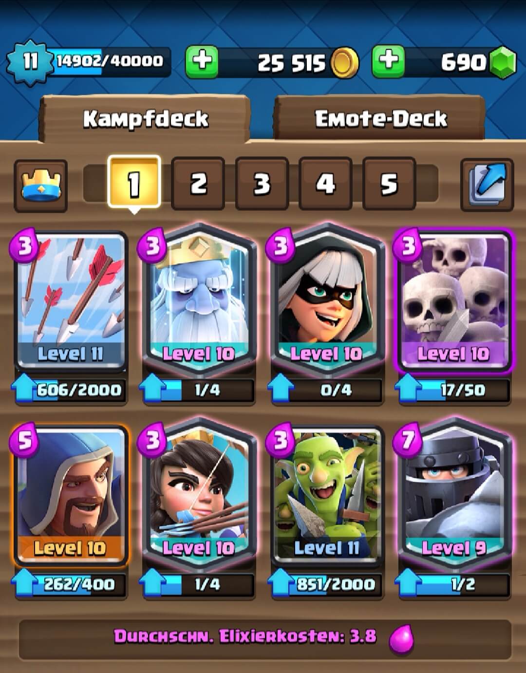 mein Problem ist folgendes! Seit knapp nen halben Jahr hänge ich in Arena 12 fest. Egal was ich versuche sobald ich nur noch einen Sieg von Arena 13 entfernt bin Falle ich um etwa 200 Pokale. Und das ist immer das selbe, ich benötige nur noch einen Sieg aber anstatt zu gewinnen ist es so Sicher wie das Amen in der Kirche das ich erstmal die nächsten Kämpfe verliere bis ich ca 200 Pokale weniger habe. Die Wahrscheinlichkeit das sowas innerhalb von 6 Monaten immer wieder passiert ist zwar so gut wie Null, aber bei Clash Royal scheint nichts unmöglich.![]()