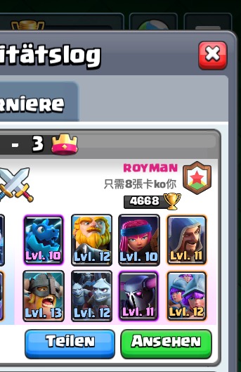 ) und kriege auch immer 11er (gegen die ich meistens gewinne) mmit level 12 karten und jeder 4 Kampf ist ein 12er. Ich beschwere mich nicht sondern versuche einfach zu gewinnen. letzens war da auch ein level 10er mit level 13er lakaienhorde (?!?!?fragt nicht wahrscheinlich hat der seit release nur truhen geöffnet oder p2win) aber ich habe gewonne weil ich Bdragon hatte -
