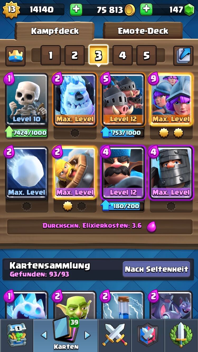 Gibt auch noch die etwas bekanntere Alternative mit Bats, Bandit und Feuerball statt Skeletten, Dark Prince und Schneeball aber ich mag den schnellen Cycle bei diesem Deck.