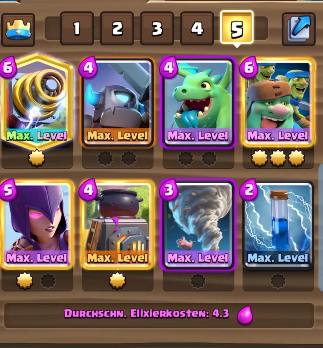 2 + 5. Habe dieses Deck in der aktuellen Royal Ghost Challange gespielt (9:0 fast nur 3 Crowns). Man kann mit dem Nado schön den King Tower mit einem gegnerischen Royal Ghost aktivieren. Sobald 3 Royal Ghosts auf ein mal kommen immer sichergehen, dass man entweder Babydragon+Nade oder Funky für diese Lain hat, dann brennt nichts an. Im Prinzip braucht man sich nur auf das Verteidigen konzentrieren, der Rest passiert dann von allein (wie in jedem dieser Modi)