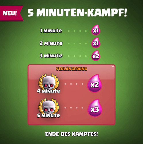 Die Spielzeit wird jetzt maximal 5 statt 6 Minuten betragen und in der letzten Minute der Nachspielzeit, also in Minute 5, switcht der Modus zu triple Elixier. Es wird weiterhin kein draw geben und diese Änderung betrifft ALLE Spielmodi außer Sudden Death logischerweise.