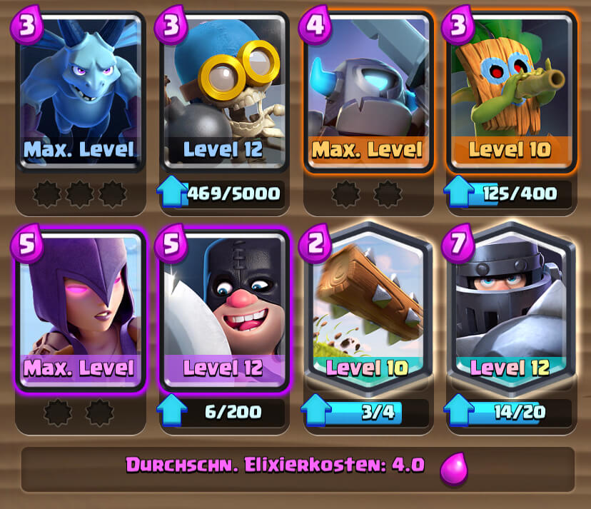 Darüber hinaus glaube ich, dass du langfristig nicht um eine Win condition rumkommst. Den Mega Ritter zähle ich nicht wirklich als Win condition weil viel zu leicht vom Turm ablenkbar. Selbst wenn dein Deck Max ist wirst du spätestens bei 6000 Pokalen mächtig Probleme bekommen, weil jeder gute Spieler dich mit den Einheiten nie den Turm erreichen lassen wird. Ich würde da die Widderreiterin oder den Ballon anstelle der Hexe empfehlen, etwas f2p freundlicher vielleicht auch den Rammbock. Aber solange mit dem Deck alles gut geht, ist das ja natürlich kein Muss.