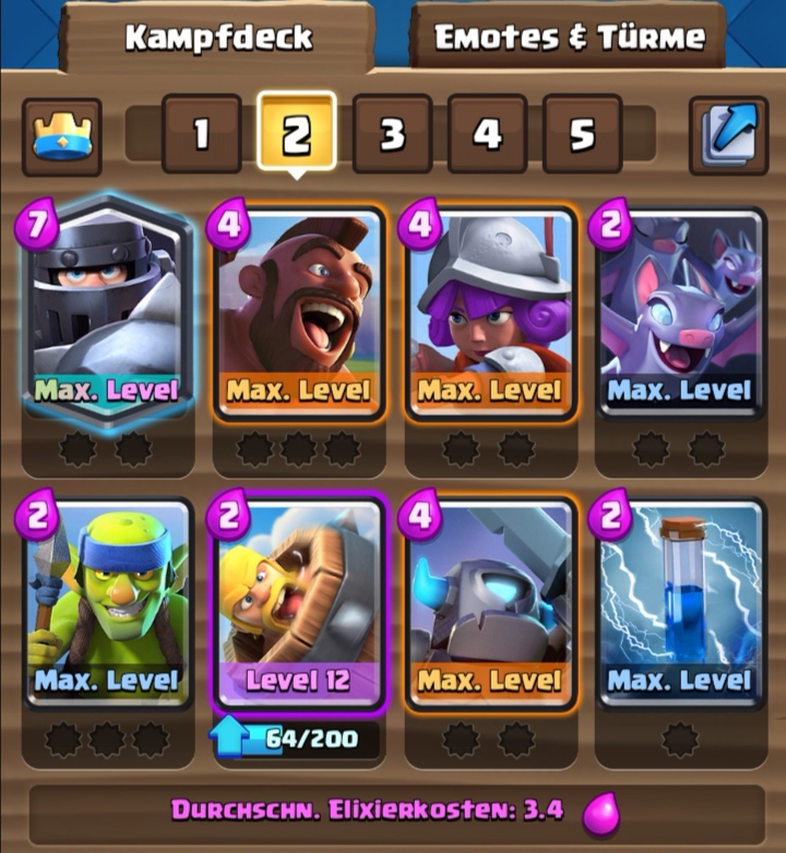 #5 Nicht schlecht das Deck. Einzelne Karten sind ja immer geschmacksabhängig, daher würd ich eher Holz statt Fass spielen, damit erwischt man mehr, weil breiter und es rollt weiter, Killt Prinzessinnen und die Blasenkobolde, stösst zurück und macht auch zuverlässig etwas Turmschaden. Aber das geschmacks und levelabhängig. Viel Erfolg mit deinem Deck;)