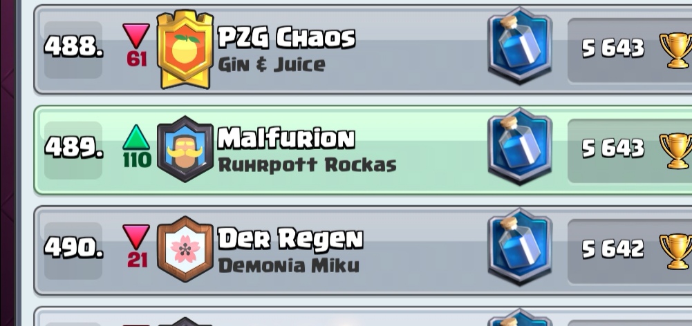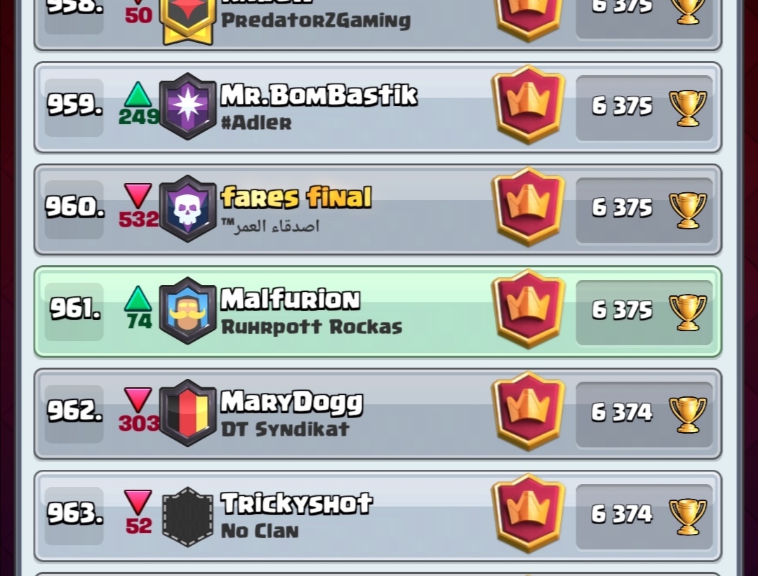 oh ich war auch so hoch. Also es ist schon möglich mit Glück und mit dem Deck zu gewinnen. Aber jetzt bin ich 300 Trophäen gefallen. Das wird wohl nichts mehr dieses Wochenende. Auf jeden Fall kann ich seit gestern nicht mehr gewinnen.