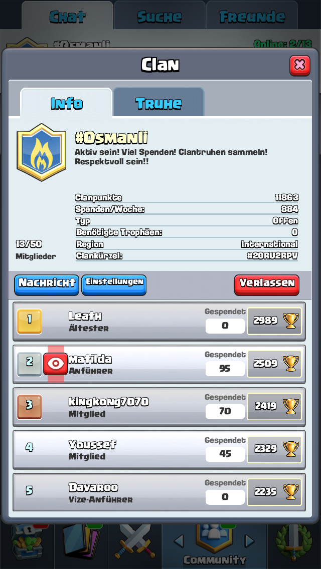 Spendenanfragen werden immer erfüllt und die Clantruhen sollten auch immer drin sein.