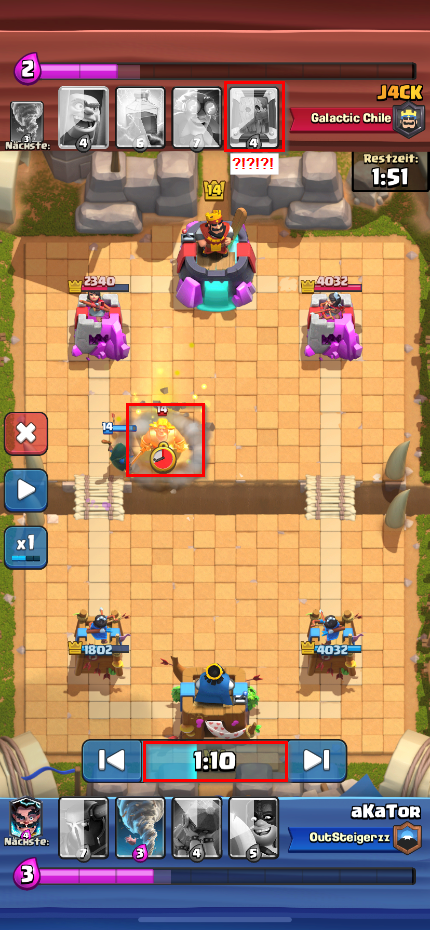 Ich gebe mal ein ganz plumpes Beispiel: Ich setze Golem als Tank, habe z.B. kein Zap oder sonst was im Deck um einen Angriff zu unterbrechen. Tank läuft vor, ich setze z.B. Hexe als Support dahinter, Gegner setzt als Beispiel Infernoturm leicht mittig, damit der Golem natürlich als erstes den Turm angreift. Sollten von den Skeletten welche vorlaufen das sie vom Turm angegriffen werden, zappt der Gegner sie weg und dein Golem bzw. Tank wird direkt "vernichtet".