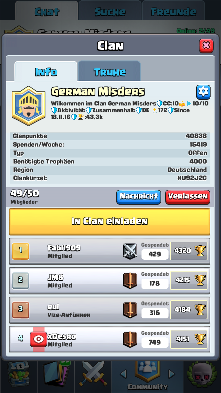 Hey,wer noch auf der Suche nach einem korrekten und aktiven Clan ist und mindestens 4000 Pokake hat, kann gerne mal German Misders besuchen! Wir streben die Top 200 DE an.