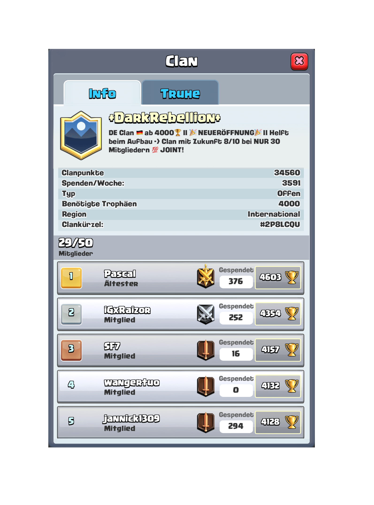 da in dem kommenden Update evtl. eine Art "Clanwars-Feature" auftauchen könnte suchen wir einen Clan mit dem wir fusionieren könnten. Wir sind ein recht junger Clan mit 30 starken und aktiven Membern. Unser, im Leadder "bester" Spieler hat etwa 4600 Trophäen, unser "schwächster" ca. 3500. Monatlich wird die Mindest Trophäenanzahl erhöht (im Moment bei 3500), des Weiteren sind 20 Kronen bei der Clan-Chest Pflicht. Beförderung gibt es sobald jemand Top 1 beim Kronensammeln wird.