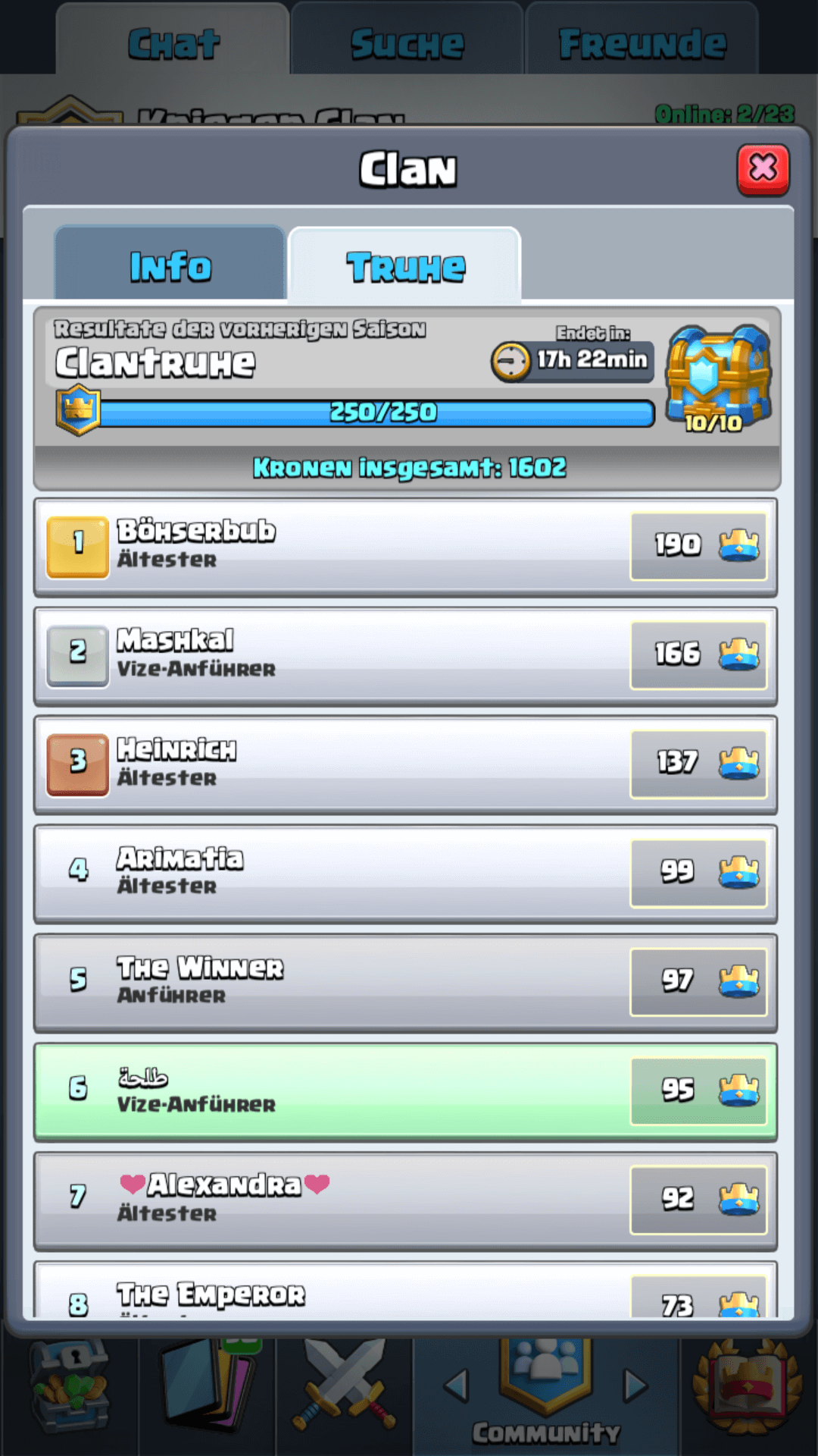 du kannst gerne zu uns kommen. Wir suchen zur Zeit aktive Spieler und haben trotz der geringen Mitglieder (momentan 22) meist gute Ergebnisse bei der Clantruhe. Letztens waren es z.B. 10/10.