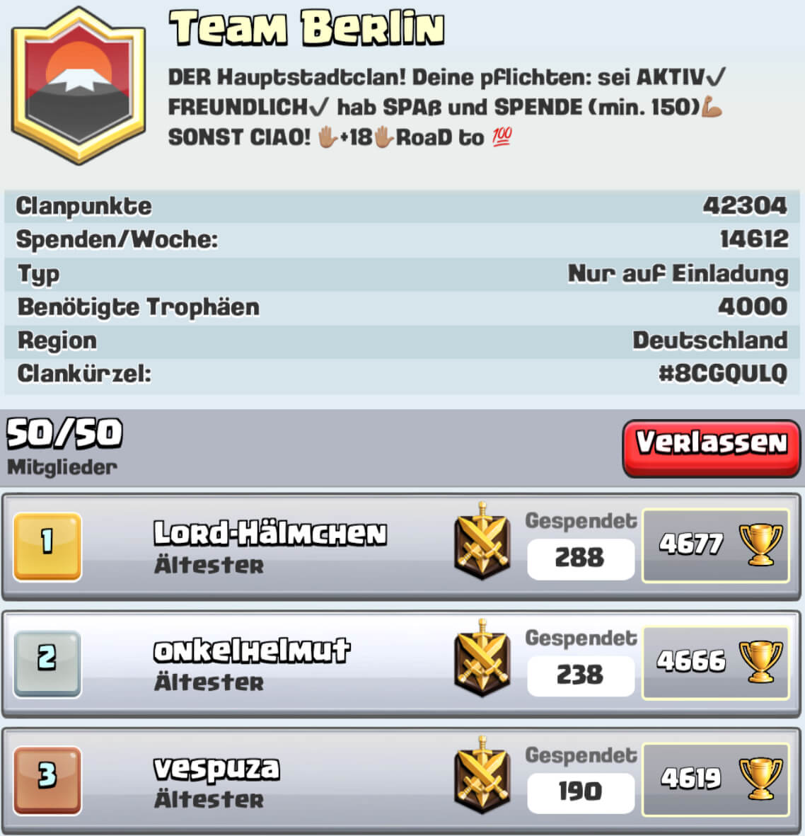 Juten Tach. Wir sind ein sehr aktiver Clan, der kurz vor den Top 200 Lokal steht im Ranking und deswegen immer neue aktive Spieler sucht ab 4000 Tropehen. Schau doch einfach mal vorbei und mach dir selber ein Bild.