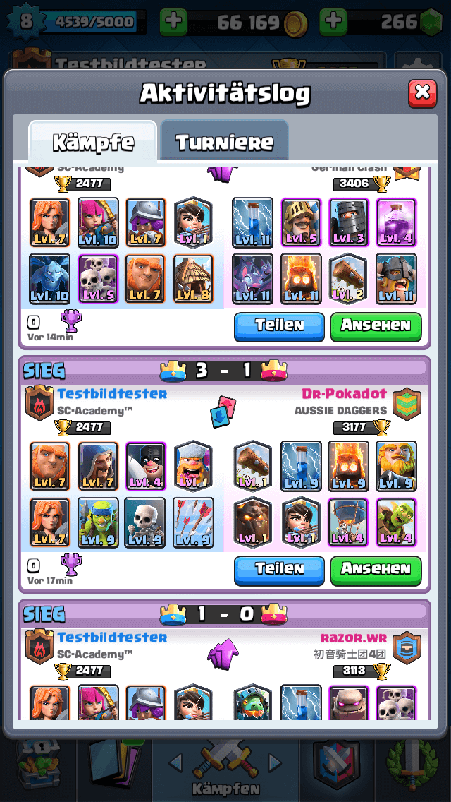 Bei Turnieren u. Challenge lief es wenigstens vom Level ausgeglichener aber oftmals nicht vom Deck her besse. Allerdings das ist ja nur nebensächlich und ist nicht das warum man CR spielt. Wie ich immer schrieb , manchmal ist weniger mehr und mehr Karten im Spiel bedeutet eben auch mehr Möglichkeiten dafür aber immer weniger Chancen sich auf das Gegenüber einzustellen. Man kann eigentlich schon am Spielanfang erkennen das die Karten selbst wenn sie Unterlevelt sind mit dem Deck was man eben gerade spielt den Gegner weghaut oder halt umgekehrt.