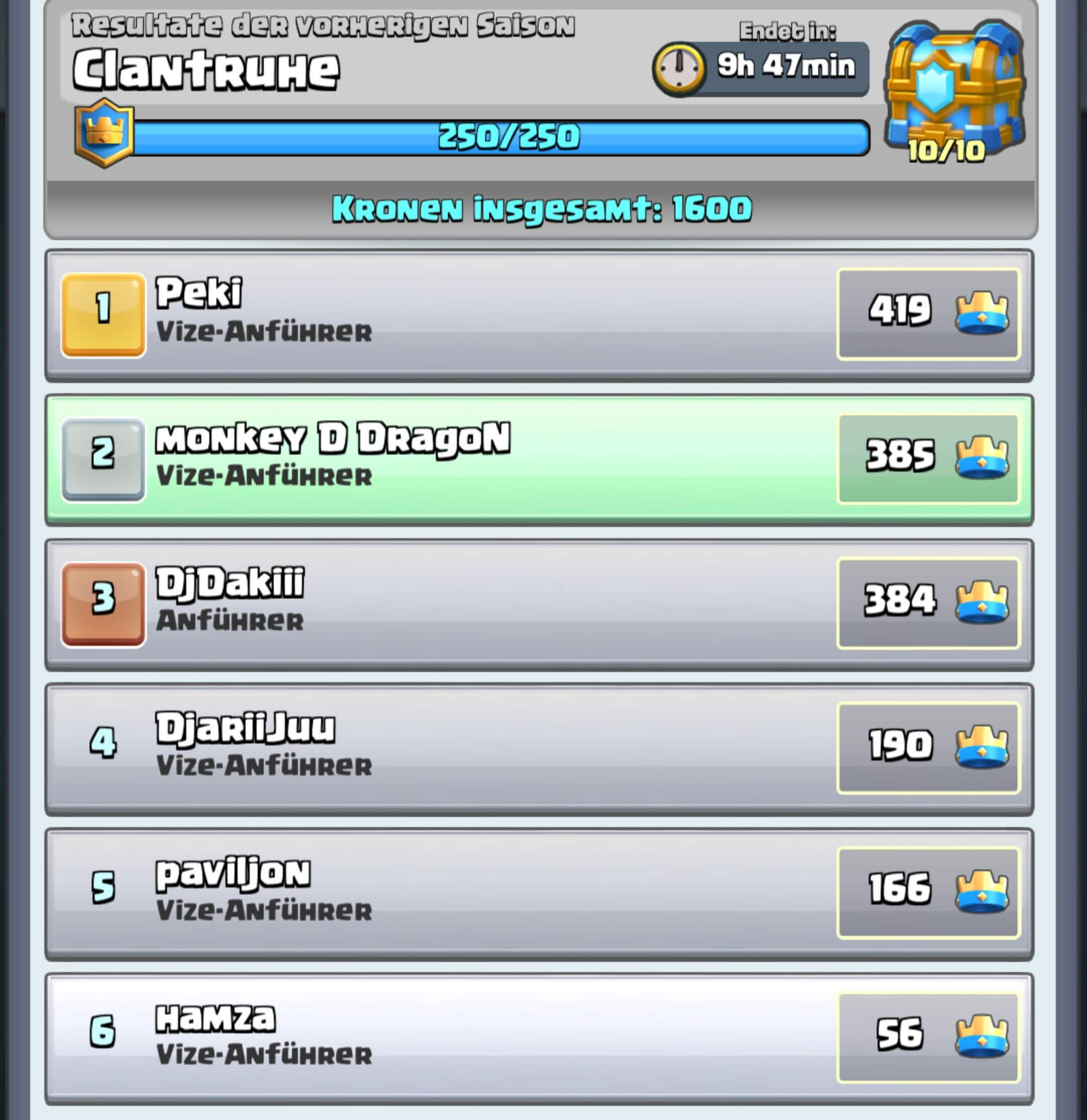 WIR SIND EIN CLAN DER GERNE KARTEN SPENDETUND AKTIV SPIELT WIR HABEN SOGAR ZU 6 DIE CLANTRUHE GEHOLT :)))) WIR BRAUCHEN NOCH 4 LEUTE FÜR DEN CLANKRIEG DESTO MEHR DESTO BESSER ICH BIN AUF 3600 ZB MONKEY D DRAGON